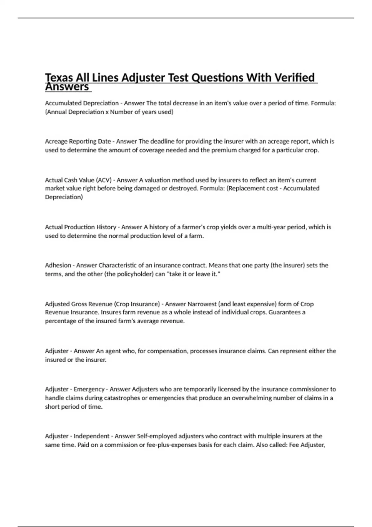Texas All Lines Adjuster Test Questions With Verified Answers