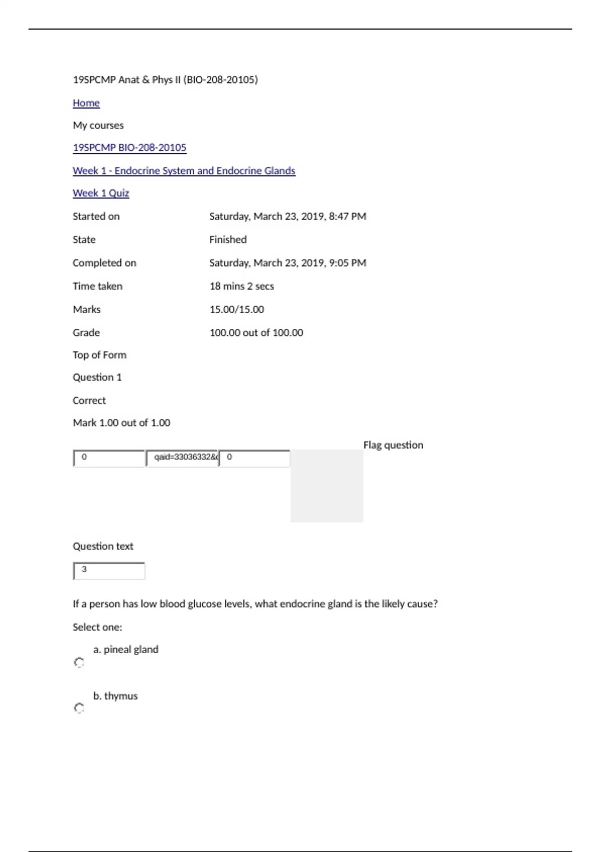 Question 1 Correct Mark 1.00 out of 1.00 Flag question Question text If a person has low blood glucose levels, what endocrine gland is the likely cause? Select one: a. pineal gland b. thymus 0 qaid=&q 0 3 c. pancreas d. adrenal gland Feedback The correct answer is: pancreas Question 2 Correct Mark 1.00 out of 1.00 Flag question Question text What would occur if adrenocorticotropic hormone and cortisol levels increased? Select one: a. adrenocorticotropic hormone levels would decline from high cortisol levels b. positive feedback causes an increase in adrenocorticotropic hormone production c. cortisol levels would decline because of an increase in adrenocorticotropic hormone levels d. none of these choices are correct Feedback The correct answer is: adrenocorticotropic hormone levels would decline from high cortisol levels Question 3 0 qaid=&q 0 3 Correct Mark 1.00 ou