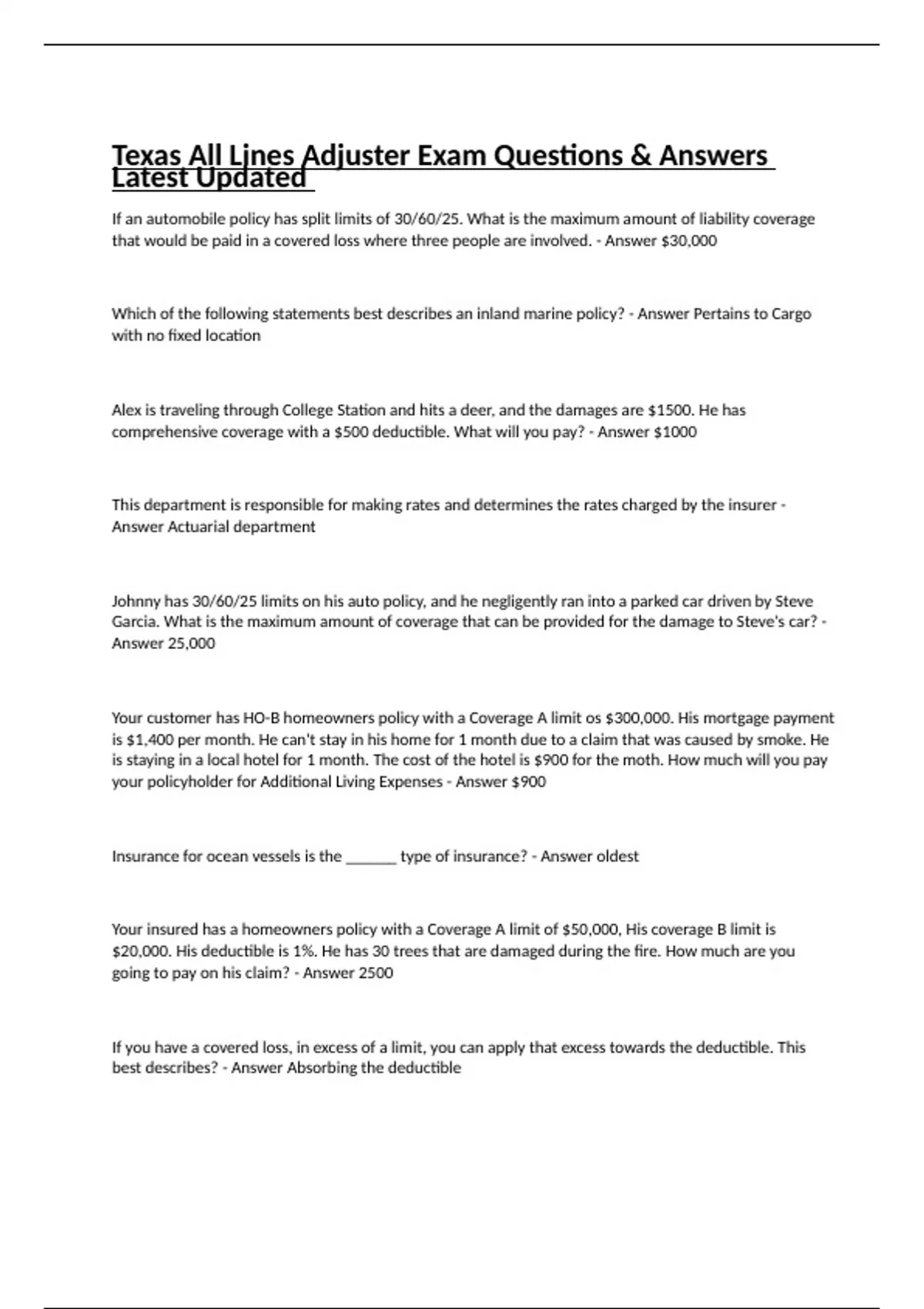 Texas All Lines Adjuster Exam Questions & Answers Latest Updated