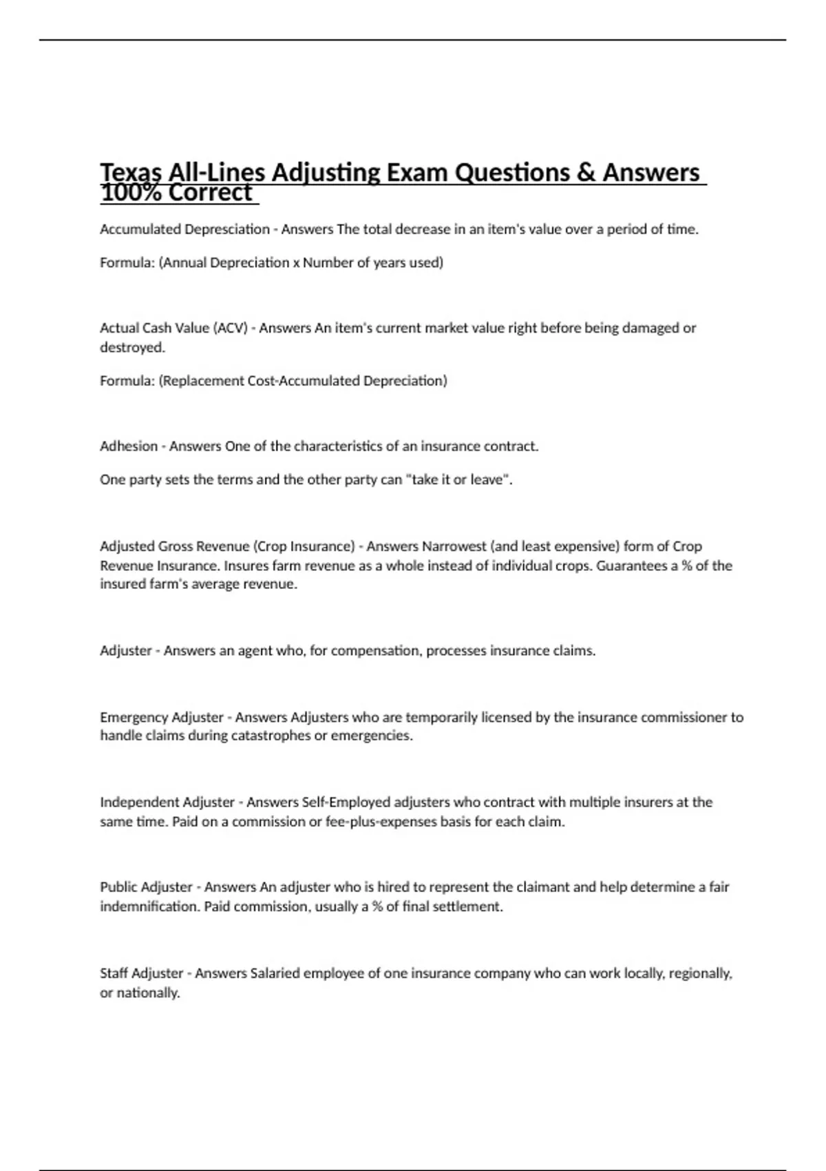 Texas All-Lines Adjusting Exam Questions & Answers 100% Correct
