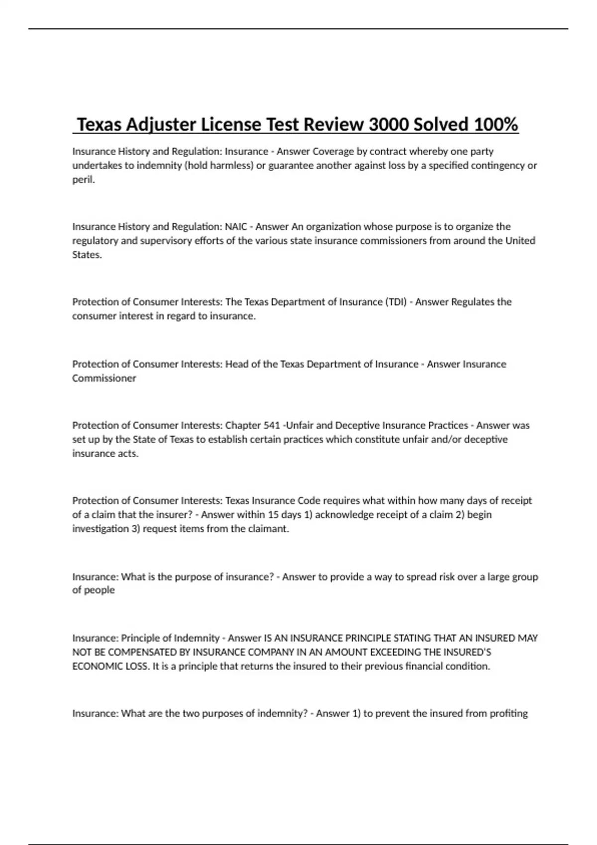 Insurance History and Regulation: Insurance - Answer Coverage by contract whereby one party undertakes to indemnity (hold harmless) or guarantee another against loss by a specified contingency or peril. Insurance History and Regulation: NAIC - Answer An organization whose purpose is to organize the regulatory and supervisory efforts of the various state insurance commissioners from around the United States. Protection of Consumer Interests: The Texas Department of Insurance (TDI) - Answer Regulates the consumer interest in regard to insurance. Protection of Consumer Interests: Head of the Texas Department of Insurance - Answer Insurance Commissioner Protection of Consumer Interests: Chapter 541 -Unfair and Deceptive Insurance Practices - Answer was set up by the State of Texas to establish certain practices which constitute unfair and/or deceptive insurance acts. Protection of Consumer Interests: Texas Insurance Code requires what within how many days of receipt of a claim that the insurer? - Answer within 15 days 1) acknowledge receipt of a claim 2) begin investigation 3) request items from the claimant. Insurance: What is the purpose of insurance? - Answer to provide a way to spread risk over a large group of people Insurance: Principle of Indemnity - Answer IS AN INSURANCE PRINCIPLE STATING THAT AN INSURED MAY NOT BE COMPENSATED BY INSURANCE COMPANY IN AN AMOUNT EXCEEDING THE INSURED'S ECONOMIC LOSS. It is a principle that returns the insured to their previous financial condition. Insurance: What are the two purposes of indemnity? - Answer 1) to prevent the insured from profiting from a loss 2) to reduce moral hazard Insurance: what is risk? - Answer (1) the potential for a financial loss or the statistical chance of danger from exposure to a hazard or peril (2) the uncertainty about loss that exists whenever more than one outcome is possible Insurance: Proximate Cause - Answer is the first event in an uninterrupted chain of events that leads to a loss Insurance: What are the 2 types of risk? - Answer Speculative: affords the opportunity for gain as well as the possibility of loss Pure: a risk where there is the potential of real loss due to exposure to a peril Insurance: example of risk avoidance - Answer to avoid risks associated with swimming pools, don't buy a home with a pool. Insurance: example of risk reduction - Answer to reduce fire damage, install a sprinkler system in home Insurance: Example of risk retention - Answer insurance company accepts risk when they've accepted the insured. Insurance: example of risk transference - Answer purchasing insurance, transfers the risk from insured to insurance company. Insurance: what is a peril? - Answer The actual cause of a loss. Insurance: what are the two types of perils? - Answer 1) named peril -- specifies which perils are insured against 2) open peril / all risk peril -- insures against all perils unless specifically excluded in the policy Insurance: 14 most common named perils - Answer 1. lightning/fire 2. sudden & accidental damage from smoke 3. explosions 4. windstorms, hurricane or hail 5. theft 6. vehicle damage 7. aircraft damage 8. vandalism/malicious mischief (V/MM) 9. falling objects 10. weight of snow, ice or sleet 11. sudden and accidental water damage from plumbing, heating, or A/C overflow 12. freezing damage to plumbing 13. riots 14. civil disobedience Insurance: What is a hazard? - Answer situations or behaviors that increase the risk of loss of property Insurance: Name the three kinds of hazards and give an example of each - Answer 1) Physical -- large hole in the front yard where someone could step in and hurt themselves 2) Morale -- leaving a home with the doors unlocked and the windows opened 3) Moral -- embezzlement Insurance: List and define the 2 types of losses - Answer 1) Direct loss -- damage that is a direct result of a covered peril such as a fire destroying a home 2) Indirect loss -- consequential loss resulting indirectly from a direct loss due to a covered peril such as loss of business income or loss of use Claims Adjuster: What is a Staff/Company Adjuster? - Answer work for the insurance company such as State Farm and handle claims on behalf of the insurer; they are paid a salary with benefits. Claims Adjuster: What is an Independent Adjuster? - Answer work for the insurance companies to handle and evaluate certain claims on an as-needed basis; they are paid a percentage of the claims they settle Claims Adjuster: What is a Public Adjuster? - Answer work for the insured to make an evaluation of loss to be presented to the insurer; they are paid on a fee basis (usually 10%) and are usually required to carry an adjuster bond Claims Adjuster: CAT ( catastrophic) Adjusters - Answer represent the insurance company that hired the catastrophic adjusting company that you are doing claims for Claims Adjuster: 11 things that a claims adjuster may do - Answer 1) Determine coverage 2) determine amount of damage 3) prepare report of findings 4) Try to work out a fair settlement 5) prepare a claim file 6) interview with insured and/or witnesses 7) inspect and estimate property damage or loss 8) consult police, fire dept. and medical reports 9) take pictures and draw diagrams 10) make advance settlement payments 11) attend court hearings if necessary Claims Adjuster: 4 educational requirements that are suggested for adjusters to have - Answer 1) a combination of related education and on-the-job experience 2) at least a high school diploma 3) some post high school education is an asset 4) a valid driver's license Claims Adjuster: Initial contact with the insured should be within __________ of receiving the claim. - Answer 24 hours Claims Adjuster: The insurer has _________ to respond to a claim during non-catastrophic situations. - Answer 15 days Claims Adjuster: During catastrophic situations, the insurer has _________ to respond to a claim. - Answer 30 days Claims Adjuster: Adjusters are __________________ for th