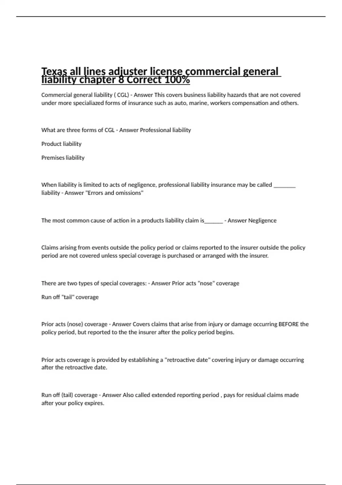 Texas all lines adjuster license commercial general liability chapter 8 Correct 100%