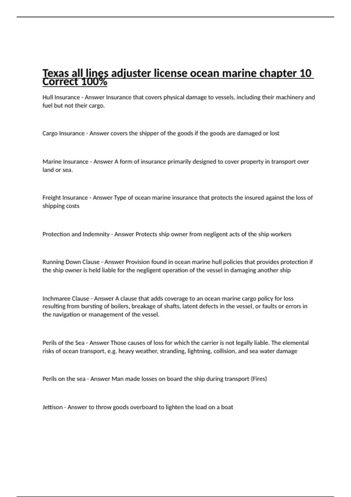 Texas all lines adjuster license ocean marine chapter 10 Correct 100%
