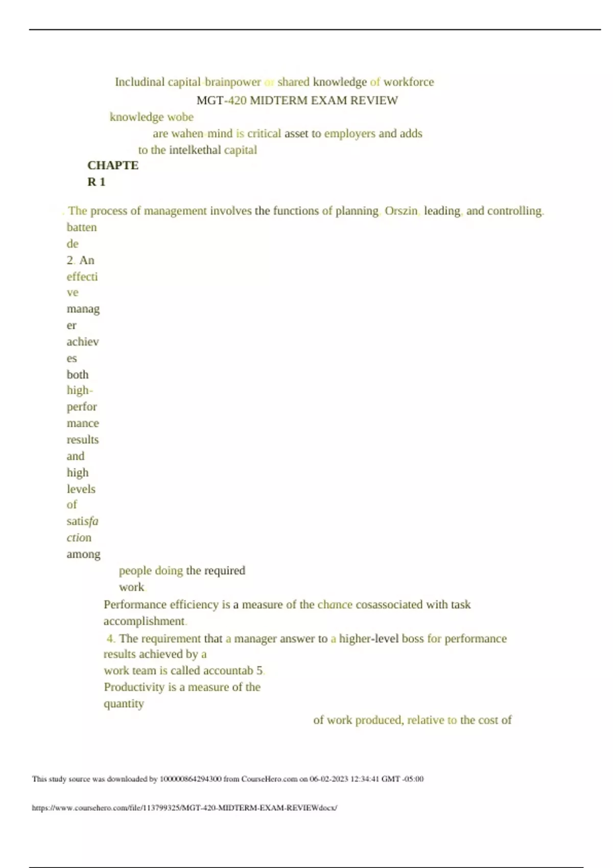 MGT 420 Topic 4 Benchmark - Midterm Exam Review (v1)