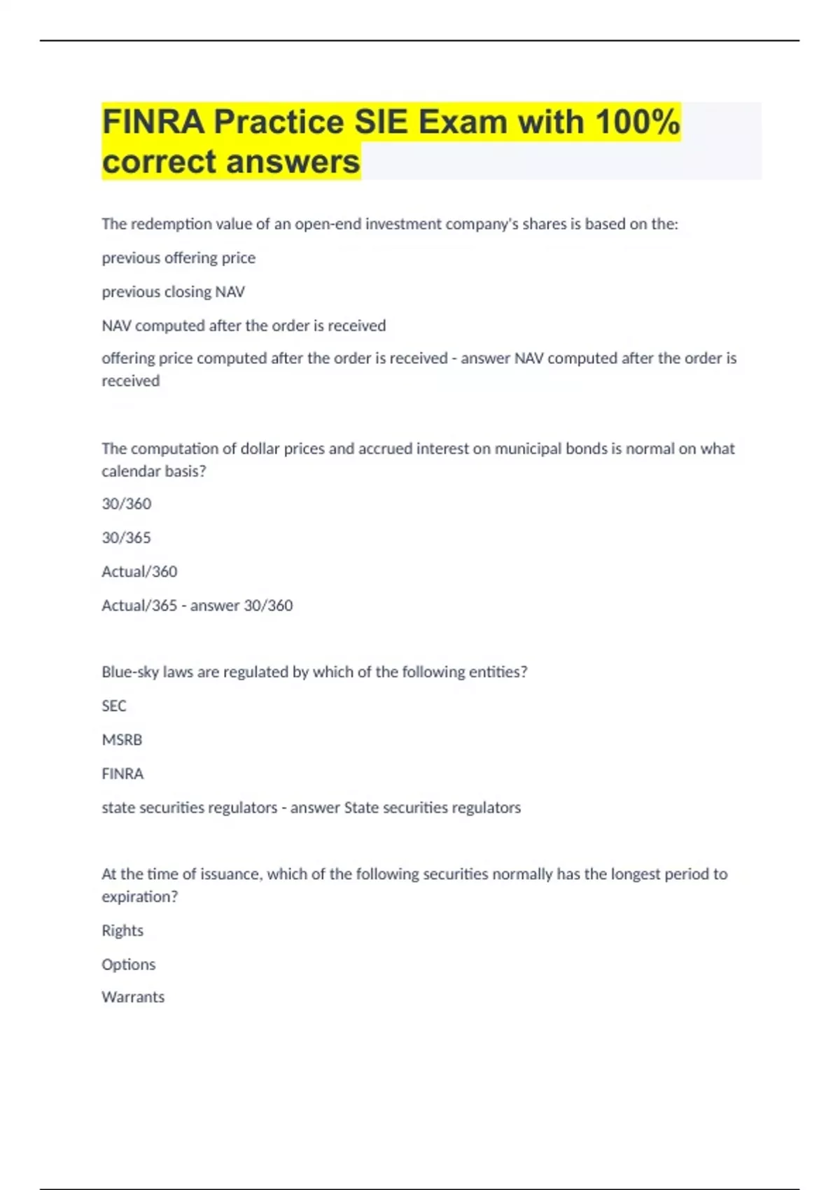 The redemption value of an open-end investment company's shares is based on the: previous offering price previous closing NAV NAV computed after the order is received offering price computed after the order is received NAV computed after the order is received The computation of dollar prices and accrued interest on municipal bonds is normal on what calendar basis? 30/360 30/365 Actual/360 Actual/365 30/360 Blue-sky laws are regulated by which of the following entities? SEC MSRB FINRA state securities regulators State securities regulators At the time of issuance, which of the following securities normally has the longest period to expiration? Rights Options Warrants Repurchase agreements Warrants Regular way settlement on Treasury Bonds is: same day next business day second business day fifth business day next business day A firm is a participant in a public offering. To sell a substantial amount of the securities to its customers, the firm agrees to repurchase the shares at no less than the original sales price. Such agreements are: prohibited as fraudulent and manipulative. Permissible if the securities are deposited into escrow. prohibited unless the firm immediately sets aside funds for the repurchase permissible if the customers retain the right to sell the securities into the open market. prohibited as fraudulent and manipulative Under SEC S-P (Consumer Privacy), which of the following information must a firm include in its customer privacy and opt-out notices? the address of the firm's website the fee to opt out from the privacy program the deadline by which to opt out from the privacy program the policies to protect the security of nonpublic information the policies to protect the security of nonpublic information UTMA accounts are opened under the tax ID number of the: minor donor parent custodian minor Under FINRA rules, noncash compensation connected with the sale of variable contracts includes all of the following items EXCEPT: gifts meals lodging commissions commissions Describe the difference between primary distribution and secondary distribution. a primary distribution involves a sale of newly issued shares by the issuer while a secondary distribution involves the sale of already issued and outstanding shares If a market maker posts a quotes of 10.00 - 10.10 (25x10), which of the following actions is the market maker willing to take? sell 1,000 shares at $10 and buy 2,500 shares at $10.10 buy 2,500 shares at $10 and sell 1,000 shares at $10.10 sell 100 shares at $10 and buy 250 shares at $10.10 buy 250 shares at $10 and sell 100 shares at $10.10 buy 2,500 shares at $10 and sell 1,000 shares at $10.10 All of the following risks apply to both foreign and domestic debt instruments EXCEPT: political exchange repayment interest rate exchange A married couple who earned income that exceeded $300k in each of the prior two years and reasonably expects the same for this current year is: a qualified investor an accredited investor an institutional investor a qualified institutional buyer an accredited investor The owner of which of the following products is MOST exposed to inflationary risks? utility stocks treasury bills treasury bonds blue chip industrials treasury bonds What is the concept of an annuity contract? the kind of annuity selected partly determines the payment amounts to the annuitant Which of the following statement is true about all US Gov agency issues? they are exempt from federal taxes they are exempt from registration under the Securities Act of 1933 they are issued in bearer form only they are general obligations of the fed gov they are exempt from registration under the Securities Act of 1933 Direct participation programs (DPP's) provide: liquidity and transparency exposure to non-correlated assets with steady returns market-related correlations with higher average returns investors with direct purchases of stock from public companies exposure to non-correlated assets with steady returns Which of the following outcomes are possible for the writer of a covered call option? profit limited and loss limited profit limited and loss unlimited profit unlimited and loss limited profit unlimited and loss unlimited profit limited and loss limited when is interest on treasury notes paid? quarterly semiannually annually at maturity semiannually an associated person who is not a registered representative is permitted to engage in which of the following activities? accept an unsolicited customer order provide account opening forms to a new customer discuss the attributes of a particular investment product prequalify prospective customers as to investment objectives provide account opening forms to a new customer a transaction in which a writer covers a position by purchasing an option is called: closing sale closing purchase opening sale opening purchase closing purchase which of the following actions is required of a broker-dealer's anti-money laundering program? designating an AML compliance officer filing of the firm's AML program with FINRA conducting background checks of all employees identifying to regulators the employees responsible for Currency Transaction Reports designating an AML compliance officer Under the Securities Act of 1933, registration is required for which of the following securities? Eurodollar bonds municipal securities American depository receipts (ADR's) securities issued by the federal government ADR's Under Federal Reserve Regulation T, a 90-day restriction is imposed when a customer opens and closes which of the following positions? same stock on the same day in a margin account same stock in different accounts on the same day the same stock in different account in the same household the same stock in a cash account without paying for the stock in full the same stock in a cash account without paying for the stock in full the last transaction in XYZ 5.50s 2030 was at 102. this bond is selling at par premium discount asset value premium Upon expir
