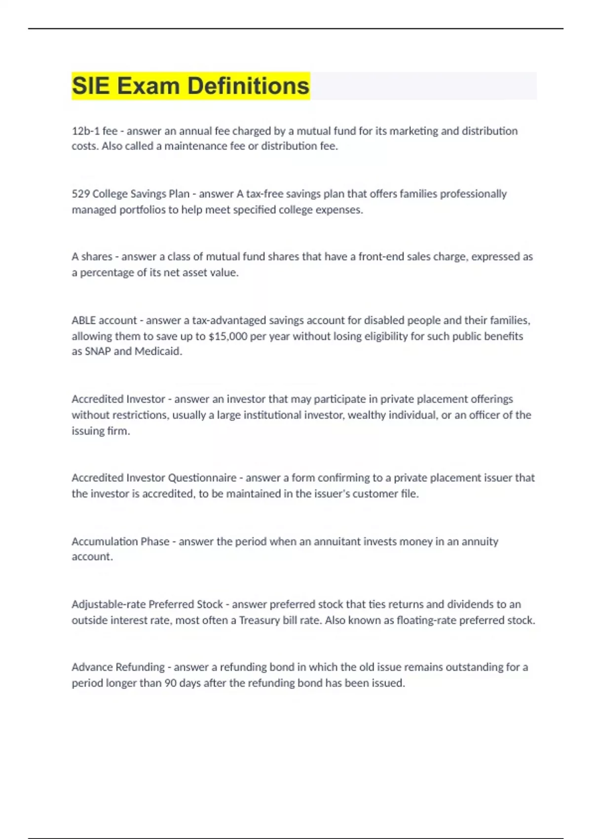 12b-1 fee an annual fee charged by a mutual fund for its marketing and distribution costs. Also called a maintenance fee or distribution fee. 529 College Savings Plan A tax-free savings plan that offers families professionally managed portfolios to help meet specified college expenses. A shares a class of mutual fund shares that have a front-end sales charge, expressed as a percentage of its net asset value. ABLE account a tax-advantaged savings account for disabled people and their families, allowing them to save up to $15,000 per year without losing eligibility for such public benefits as SNAP and Medicaid. Accredited Investor an investor that may participate in private placement offerings without restrictions, usually a large institutional investor, wealthy individual, or an officer of the issuing firm. Accredited Investor Questionnaire a form confirming to a private placement issuer that the investor is accredited, to be maintained in the issuer's customer file. Accumulation Phase the period when an annuitant invests money in an annuity account. Adjustable-rate Preferred Stock preferred stock that ties returns and dividends to an outside interest rate, most often a Treasury bill rate. Also known as floating-rate preferred stock. Advance Refunding a refunding bond in which the old issue remains outstanding for a period longer than 90 days after the refunding bond has been issued. Advisor-sold Plan a 529 college savings plan offered through an authorized investment firm that provides investment advice and more investment options, and comes with higher fees than a direct-sold plan offered by the state. Affiliate a person that directly or indirectly controls, is controlled by, or is under common control with another person. Agency Securities securities issued by government-sponsored agencies, such as Fannie Mae and Freddie Mac, but not backed by the full faith and credit of the U.S. government. Agency Transaction a transaction where a firm acts as broker, serving as an agent or go-between for the buyer and the seller. All-or-none (AON) Commitment a form of underwriting where the underwriter must sell all the shares in the offering within a specified time or the offering is voided. Alternative Minimum Tax (AMT) bond a private activity bond that qualifies for tax-exempt status but is subject to paying the alternative minimum tax. Also known as a qualified private activity bond. Compare with public purpose bond and private activity bond (PAB). American Depository Receipt (ADR) a certificate issued by the U.S. bank for the purpose of trading a specified number of shares of a foreign corporation in the U.S. stock market. American-style Option an option that can be exercised at any time prior to and including the exercise date. Also called an American option. An interest a descriptor used to indicate that a bond's purchase price will include its quoted (clean) price plus any accrued interest since the last payment date. Annuitant an individual entitled to receive benefits or payments from an annuity contract. Annuities contracts sold by an insurance company used to provide steady income to individuals after retirement, often until death. Annuitization Phase the period when an annuitant starts to receive payments from an annuity. Anticipation Notes municipal notes that are issued in advance of, or in anticipation of, an expected source of income. Arbitrage a riskless transaction in which an investor profits from buying and selling the same product for different prices at the same time in different locations. Ask Price also known as just the "ask," the price at which a market maker is willing to sell a security. Asset-backed Security a debt security backed by a pool of financial assets, such as automobile loans, credit card debt, or home equity loans. Assignment a transfer of ownership in a security or other property that gives a recipient the rights held by the previous owner. Associated Person an individual engaged in the investment banking or securities business who is registered with FINRA. At The Money a phrase indicating an options position whose exercise today would result in neither a gain nor a loss. Auction Market a securities exchange for trading securities at a physical location where buyers make bids and sellers make offers facilitated by a single market maker. Auction Rate Securities (ARS) long-term investments whose interest rates or dividend payments reset at frequent intervals by auctions, typically every 7, 14, 28, or 35 years. Authorized Shares the shares that a corporation is authorized to issue. Automatic Stabilizers government programs whose expenditures automatically fluctuate counter to the economic cycle. B Shares a class of mutual fund shares that have a deferred or back-end sales charge that declines over time and a higher annual expense than A shares. Back-end Load a sales charge that customers are charged after they redeem the shares. Also called back-end sales charges. Backing Away the failure of a broker-dealer to honor a firm quote. Balance of Payments an accounting of a country's international transactions, such as exports and imports and capital inflows and outflows. Balloon Maturity a serial bond in which one maturity, usually the last one, contains a disproportionately large amount of the principal. Bank Secrecy Act of 1970 (BSA) an act of congress that requires financial institutions in the United States to assist U.S. government agencies in detecting and preventing money laundering. Bankers' Acceptance (BA) a short-term credit instrument issued by a business for the purchase or sale of goods, drawn on and guaranteed by a bank. Basis Point one hundredth of a percentage point, the smallest increment of change in a bond's yield. Bearer Bond a bond certificate with attached coupons that is owned by whoever holds it, rather than by a registered owner. Bearish a belief that the value of a particular security or the market in general will decline. Bearish Strategy 