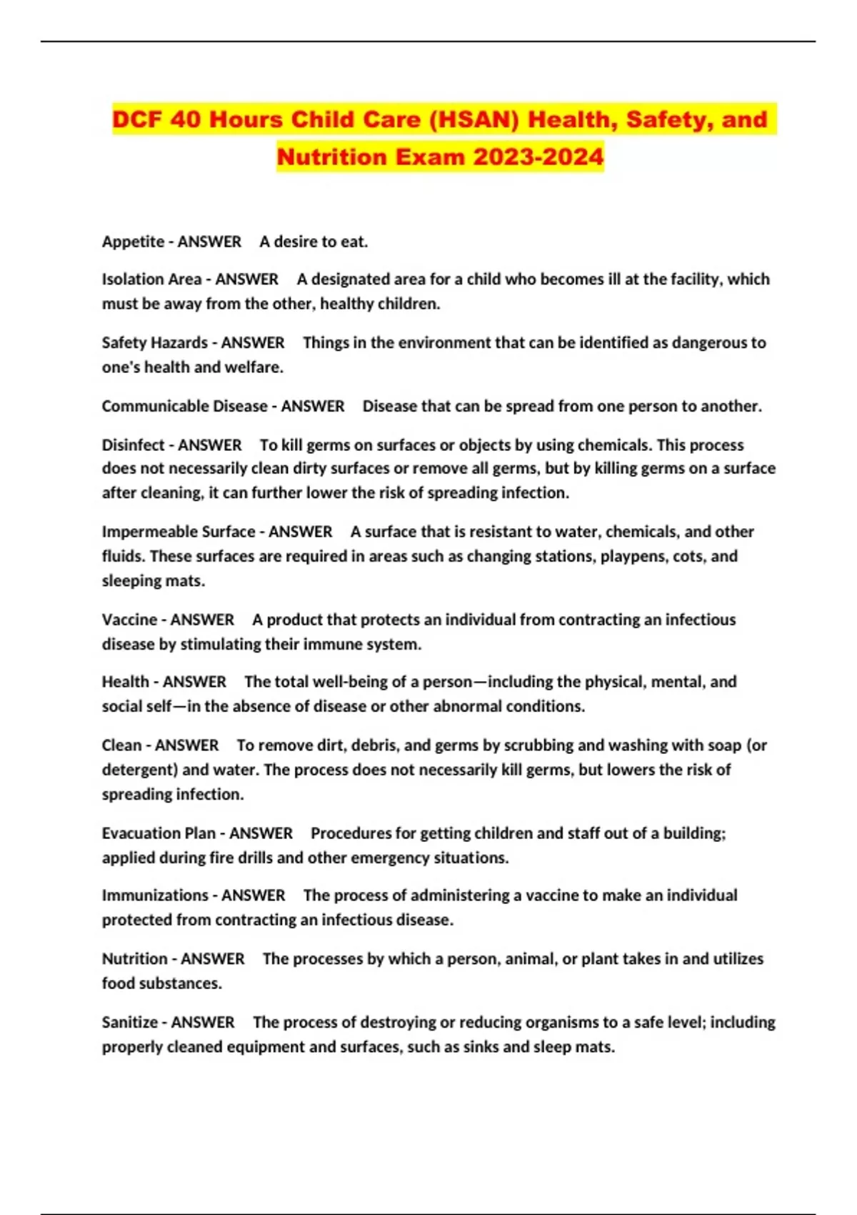 DCF 40 Hours Child Care (HSAN) Health, Safety, and Nutrition Exam ...