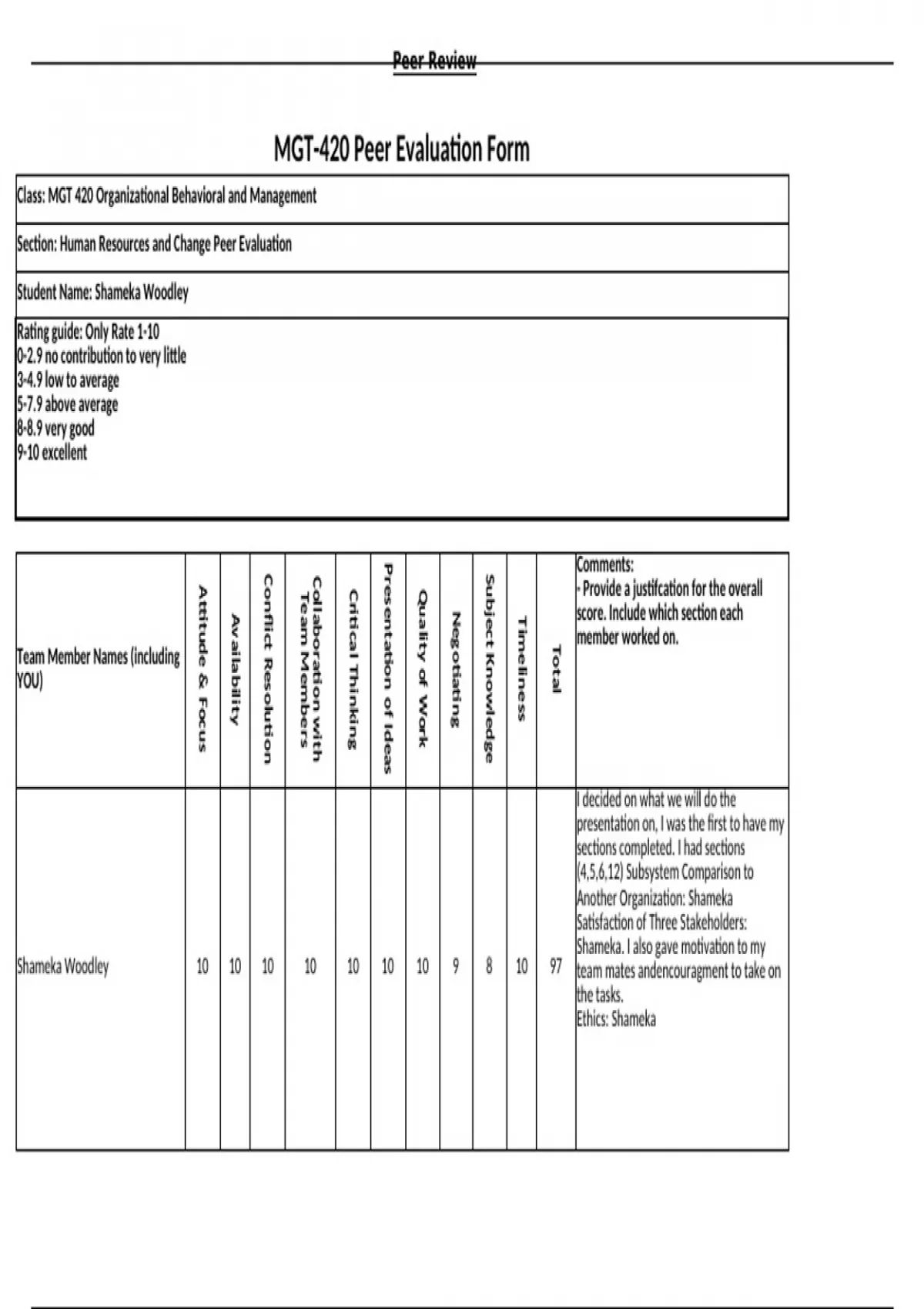 MGT 420 Topic 7 Assignment; Human Resources and Change Peer Evaluation