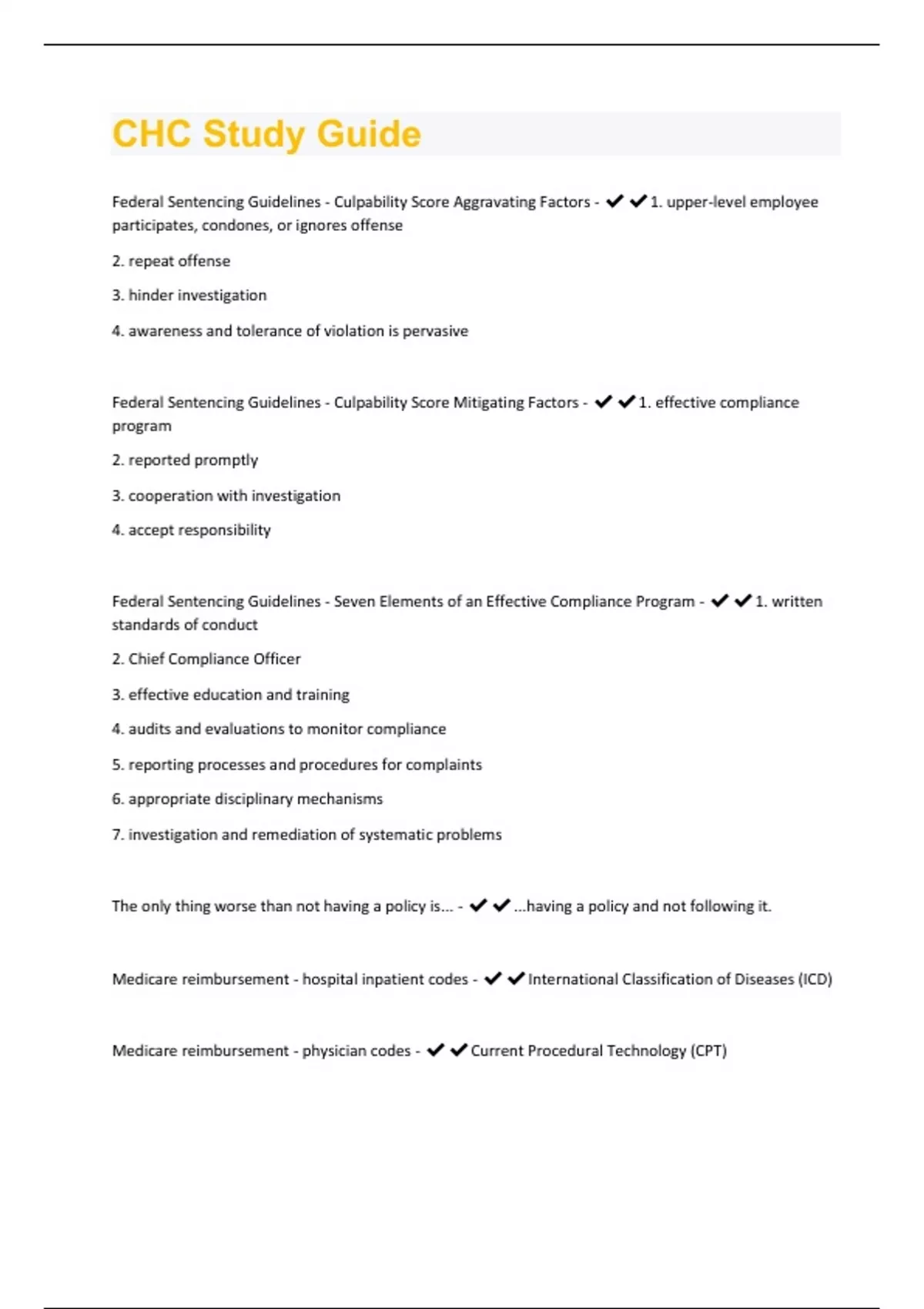 Federal Sentencing Guidelines - Culpability Score Aggravating Factors - 1. upper-level employee participates, condones, or ignores offense 2. repeat offense 3. hinder investigation 4. awareness and tolerance of violation is pervasive Federal Sentencing Guidelines - Culpability Score Mitigating Factors - 1. effective compliance program 2. reported promptly 3. cooperation with investigation 4. accept responsibility Federal Sentencing Guidelines - Seven Elements of an Effective Compliance Program - 1. written standards of conduct 2. Chief Compliance Officer 3. effective education and training 4. audits and evaluations to monitor compliance 5. reporting processes and procedures for complaints 6. appropriate disciplinary mechanisms 7. investigation and remediation of systematic problems The only thing worse than not having a policy is... - ...having a policy and not following it. Medicare reimbursement - hospital inpatient codes -International Classification of Diseases (ICD) Medicare reimbursement - physician codes - Current Procedural Technology (CPT)Questions to guide the scope of an internal investigation. - 1. What is the origin of the issue? 2. When did the issue originate? 3. How far back should the investigation go? 4. Can extrapolation of a statistical sample be used? It is in the best interest of the organization to have the board _______. - ...take an active rather than a passive role in compliance. Six tips for saving on future costs of compliance. - 1. embed quality into existing processes 2. centralize common processes and controls 3. improve human resources infrastructures 4. improve information systems processes 5. emphasize training 6. monitor marketing and compensation