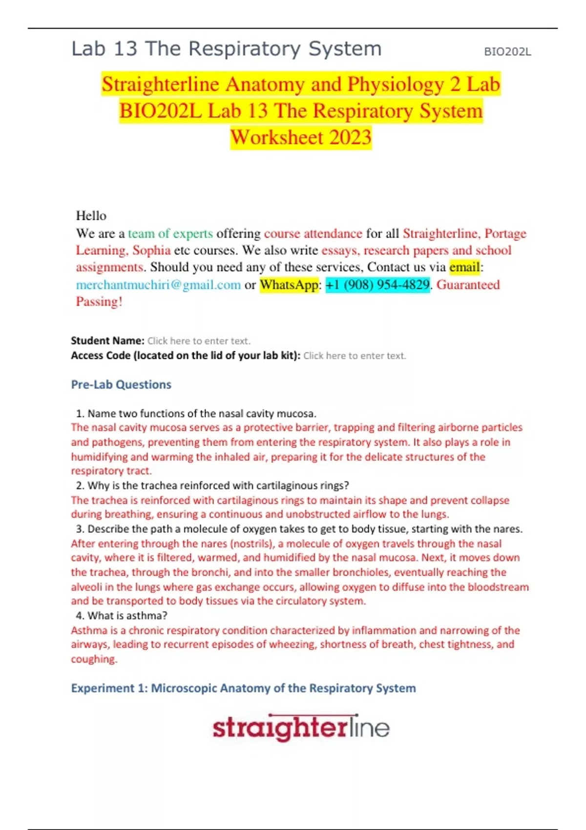 Straighterline Anatomy and Physiology 2 Lab BIO202L Lab 13 The Respiratory System Worksheet 2023