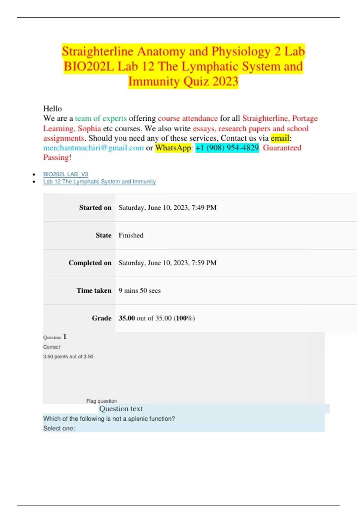 Straighterline Anatomy and Physiology 2 Lab BIO202L Lab 12 The Lymphatic System and Immunity Quiz 2023 Hello We are a team of experts offering course attendance for all Straighterline, Portage Learning, Sophia etc courses. We also write essays, research papers and school assignments. Should you need any of these services, Contact us via email: or : +1 (908) 954-4829. Guaranteed Passing! BIO202L LAB_V3 Lab 12 The Lymphatic System and Immunity Started on Saturday, June 10, 2023, 7:49 PM State Finished Completed on Saturday, June 10, 2023, 7:59 PM Time taken 9 mins 50 secs Grade 35.00 out of 35.00 (100%) Question 1 Correct 3.50 points out of 3.50 Flag question Question text Which of the following is not a splenic function? Select one:a. Destroy old blood cells. b. Produce new blood cells. c. Monitor blood flow. d. Filter blood cells. Question 2 Correct 3.50 points out of 3.50 Flag question Question text Antigens fight infections. Select one: a. True b. False Question 3 Correct 3.50 points out of 3.50 Flag question Question text How do plasma and memory cells vary by function? Select one: a. Plasma cells can secrete antibodies immediately, while memory cells can secrete antibodies at a later time, if needed. b. Plasma cells can secrete antigens immediately, while memory cells can secrete antigens at a later time, if needed. c. Plasma cells can engulf antibodies immediately, while memory cells can engulf antibodies at a later time, if needed. d. Plasma cells can engulf antigens immediately, while memory cells can engulf antigens at a later time, if needed. Question 4 Correct3.50 points out of 3.50 Flag question Question text Which of the following is NOT an organ of the immune system? Select one: a. Thymus b. Spleen c. Lymph Nodes d. Esophagus Question 5 Correct 3.50 points out of 3.50 Flag question Question text Which of the following cells plays a role in both specific and non-specific defenses? Select one: a. Neutrophils b. Lymphocytes c. Macrophages d. Eosinophils Question 6 Correct 3.50 points out of 3.50 Flag question Question text The lining of the gastrointestinal tract are an example of what type of immune system defense? Select one:a. Non-Specific b. Pre-Determined c. Specific d. Spontaneous Question 7 Correct 3.50 points out of 3.50 Flag question Question text What are the small proteins that are secreted by virally infected cells that protect neighboring cells and thwart further multiplication of viruses? Select one: a. Interferon b. Interleukins c. Heparin d. Histamine Question 8 Correct 3.50 points out of 3.50 Flag question Question text The two tissues of the spleen are: Select one: a. White Pulp and Gray Pulp b. Gray Pulp and Red Pulp c. Red Pulp and White Pulp d. Gray Pulp and Blue Pulp Question 9 Correct3.50 points out of 3.50 Flag question Question text Acquired immunity that a fetus obtains from maternal antibodies that cross the placenta is called: Select one: a. Artificially acquired natural immunity. b. Naturally acquired passive immunity. c. Naturally acquired active immunity. d. Artificially acquired active immunity. Question 10 Correct 3.50 points out of 3.50 Flag question Question text What specific type of acquired immunity to vaccines provide? Select one: a. Naturally acquired artificial immunity. b. Artificially acquired active immunity. c. Naturally acquired passive immunity. d. Artificially acquired passive immunity.