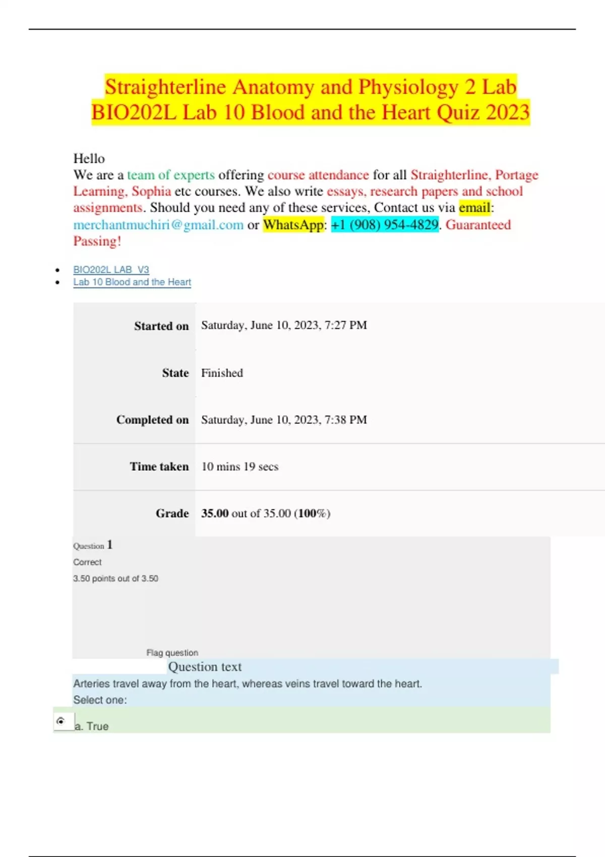 Straighterline Anatomy and Physiology 2 Lab BIO202L Lab 10 Blood and the Heart Quiz 2023 Hello We are a team of experts offering course attendance for all Straighterline, Portage Learning, Sophia etc courses. We also write essays, research papers and school assignments. Should you need any of these services, Contact us via email: or : +1 (908) 954-4829. Guaranteed Passing!  BIO202L LAB_V3  Lab 10 Blood and the Heart Started on Saturday, June 10, 2023, 7:27 PM State Finished Completed on Saturday, June 10, 2023, 7:38 PM Time taken 10 mins 19 secs Grade 35.00 out of 35.00 (100%) Question 1 Correct 3.50 points out of 3.50 Flag question Question text Arteries travel away from the heart, whereas veins travel toward the heart. Select one: a. Trueb. False Question 2 Correct 3.50 points out of 3.50 Flag question Question text Which of the following components accounts for the largest portion of blood? Select one: a. Erythrocytes b. Lymphocytes c. Platelets d. Plasma Question 3 Correct 3.50 points out of 3.50 Flag question Question text The muscular wall of the heart consists of all of the following EXCEPT: Select one: a. Epicardium b. Myocardium c. Endocardium d. All of the above compose the muscular wall of the heart. Question 4 Correct 3.50 points out of 3.50 Flag questionQuestion text What type of blood cell is responsible for blood clots? Select one: a. Erythrocytes b. Thrombocytes c. Basophils d. Neutrophils Question 5 Correct 3.50 points out of 3.50 Flag question Question text Neutrophils, eosinophils, and platelets are all types of leukocytes. Select one: a. True b. False Question 6 Correct 3.50 points out of 3.50 Flag question Question text What is NOT visible on an electrocardiogram? Select one: a. Depolarization of the ventricles. b. Depolarization of the atria. c. Repolarization of the ventricles. d. Repolarization of the atria. Question 7 Correct 3.50 points out of 3.50Flag question Question text The pulmonary semilunar valve separates what parts of the heart? Select one: a. The right atrium and the right ventricle. b. The right ventricle and the pulmonary trunk. c. The pulmonary trunk and the pulmonary arteries. d. The left atrium and the left ventricle. Question 8 Correct 3.50 points out of 3.50 Flag question Question text Areas where the plasma membranes of cardiac muscle fibers overlap are called: Select one: a. Purkinje Fibers b. Intercalated Discs c. Gap Junctions d. Desmosome Question 9 Correct 3.50 points out of 3.50 Flag question Question text A double sac of serous membrane known as the pericardium encloses the cardiac muscle. Select one:a. True b. False Question 10 Correct 3.50 points out of 3.50 Flag question Question text Which of the following is NOT true regarding the sounds associated with the heart? Select one: a. The "lub-dub" sound originates from the physical act of the heart contracting. b. The "lub-dub" sound originates from blood turbulence through the heart. c. Abnormal heart sounds are called murmurs. d. Heart murmurs are caused by improperly functioning valves.