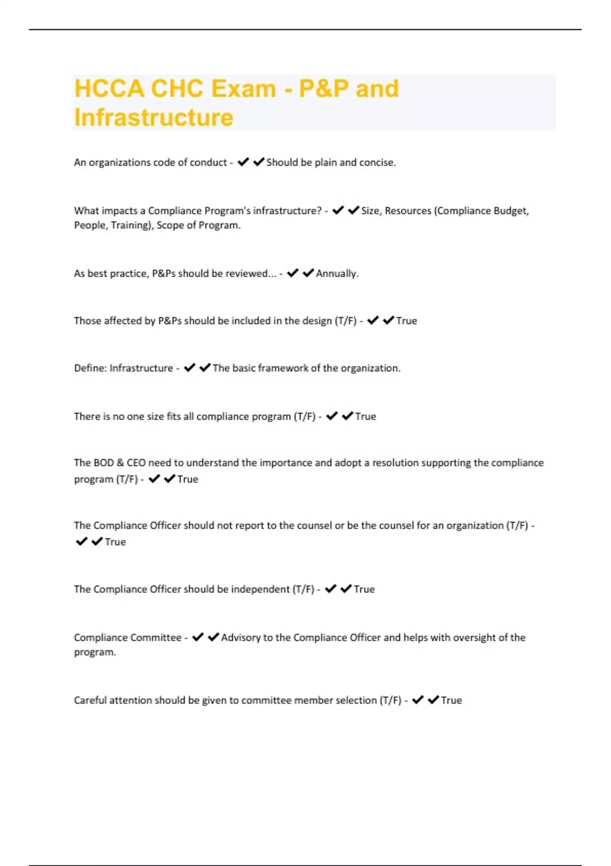 An organizations code of conduct - Should be plain and concise. What impacts a Compliance Program's infrastructure? - Size, Resources (Compliance Budget, People, Training), Scope of Program. As best practice, P&Ps should be reviewed... - Annually. Those affected by P&Ps should be included in the design (T/F) - True Define: Infrastructure - The basic framework of the organization. There is no one size fits all compliance program (T/F) - True The BOD & CEO need to understand the importance and adopt a resolution supporting the compliance program (T/F) - True The Compliance Officer should not report to the counsel or be the counsel for an organization (T/F) - True The Compliance Officer should be independent (T/F) - True Compliance Committee - Advisory to the Compliance Officer and helps with oversight of the program. Careful attention should be given to committee member selection (T/F) - TrueThe Compliance Officer should be a high level individual with the authority to make decisions (T/F) - True
