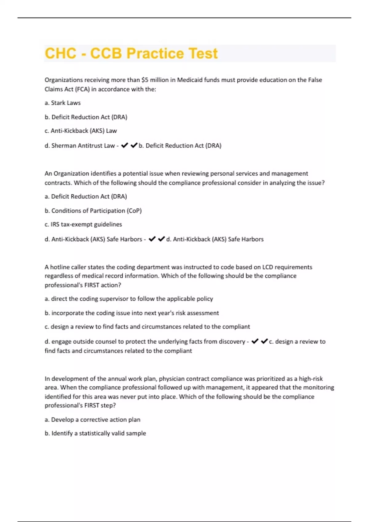 Organizations receiving more than $5 million in Medicaid funds must provide education on the False Claims Act (FCA) in accordance with the: a. Stark Laws b. Deficit Reduction Act (DRA) c. Anti-Kickback (AKS) Law d. Sherman Antitrust Law -b. Deficit Reduction Act (DRA) An Organization identifies a potential issue when reviewing personal services and management contracts. Which of the following should the compliance professional consider in analyzing the issue? a. Deficit Reduction Act (DRA) b. Conditions of Participation (CoP) c. IRS tax-exempt guidelines d. Anti-Kickback (AKS) Safe Harbors - d. Anti-Kickback (AKS) Safe Harbors A hotline caller states the coding department was instructed to code based on LCD requirements regardless of medical record information. Which of the following should be the compliance professional's FIRST action? a. direct the coding supervisor to follow the applicable policy b. incorporate the coding issue into next year's risk assessment c. design a review to find facts and circumstances related to the compliant d. engage outside counsel to protect the underlying facts from discovery - c. design a review to find facts and circumstances related to the compliant In development of the annual work plan, physician contract compliance was prioritized as a high-risk area. When the compliance professional followed up with management, it appeared that the monitoring identified for this area was never put into place. Which of the following should be the compliance professional's FIRST step? a. Develop a corrective action plan b. Identify a statistically valid samplec. Conduct a probe sample d. Notify legal counsel - c. Conduct a probe sample A compliance professional identified an issue with medical necessity. The compliance professional should collaborate with the: a. case manager b. billing clerk c. documentation specialist d. patient account representative - a. case manager When non-compliance is substantiated, disciplinary action should be administered a. within 30 days b. if intent is proven c. in a consistent manner d. after completion of corrective action - c. in a consistent manner Which of the following is the BEST question to include in an employee exit interview? a. Why are you leaving your job? b. Did you ever observe anything that made you feel uncomfortable? c. How many times did you use the compliance hotline? d. Do you think your patients knew about the hotline? - b. Did you ever observe anything that made you feel uncomfortable? A compliance professional is conducting a policy review. Which of the following procedures MUST be included in the policy for statistically valid sampling and extrapolation? a. financial error rate exceeds 5% with a refund to occur within 60 days b. financial error rate exceeds 5% with a refund to occur within 90 days c. coding error rate exceeds 5% with a refund to occur within 60 days d. coding error rate exceeds 5% with a refund to occur within 90 days - a. financial error rate exceeds 5% with a refund to occur within 60 days