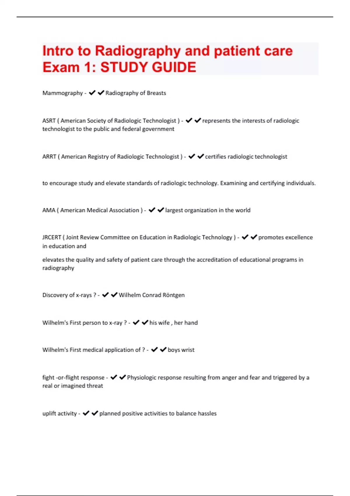 Mammography - Radiography of Breasts ASRT ( American Society of Radiologic Technologist ) - represents the interests of radiologic technologist to the public and federal government ARRT ( American Registry of Radiologic Technologist ) - certifies radiologic technologist to encourage study and elevate standards of radiologic technology. Examining and certifying individuals. AMA ( American Medical Association ) - largest organization in the world JRCERT ( Joint Review Committee on Education in Radiologic Technology ) - promotes excellence in education and elevates the quality and safety of patient care through the accreditation of educational programs in radiography Discovery of x-rays ? - Wilhelm Conrad Röntgen Wilhelm's First person to x-ray ? - his wife , her hand Wilhelm's First medical application of ? - boys wrist fight -or-flight response - Physiologic response resulting from anger and fear and triggered by a real or imagined threat uplift activity - planned positive activities to balance hassles