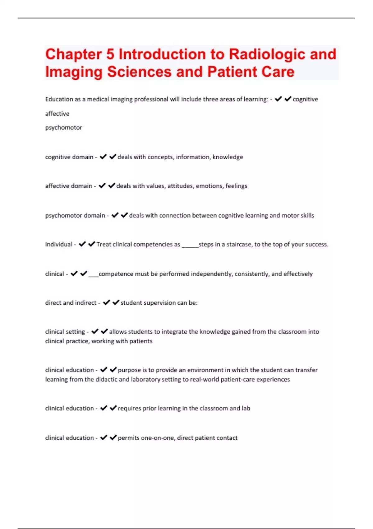 Education as a medical imaging professional will include three areas of learning: - cognitive affective psychomotor cognitive domain - deals with concepts, information, knowledge affective domain - deals with values, attitudes, emotions, feelings psychomotor domain - deals with connection between cognitive learning and motor skills individual - Treat clinical competencies as _____steps in a staircase, to the top of your success. clinical - ___competence must be performed independently, consistently, and effectively direct and indirect - student supervision can be: clinical setting - allows students to integrate the knowledge gained from the classroom into clinical practice, working with patients clinical education - purpose is to provide an environment in which the student can transfer learning from the didactic and laboratory setting to real-world patient-care experiences clinical education - requires prior learning in the classroom and lab clinical education - permits one-on-one, direct patient contactbased on performance objectives - observable student behavior