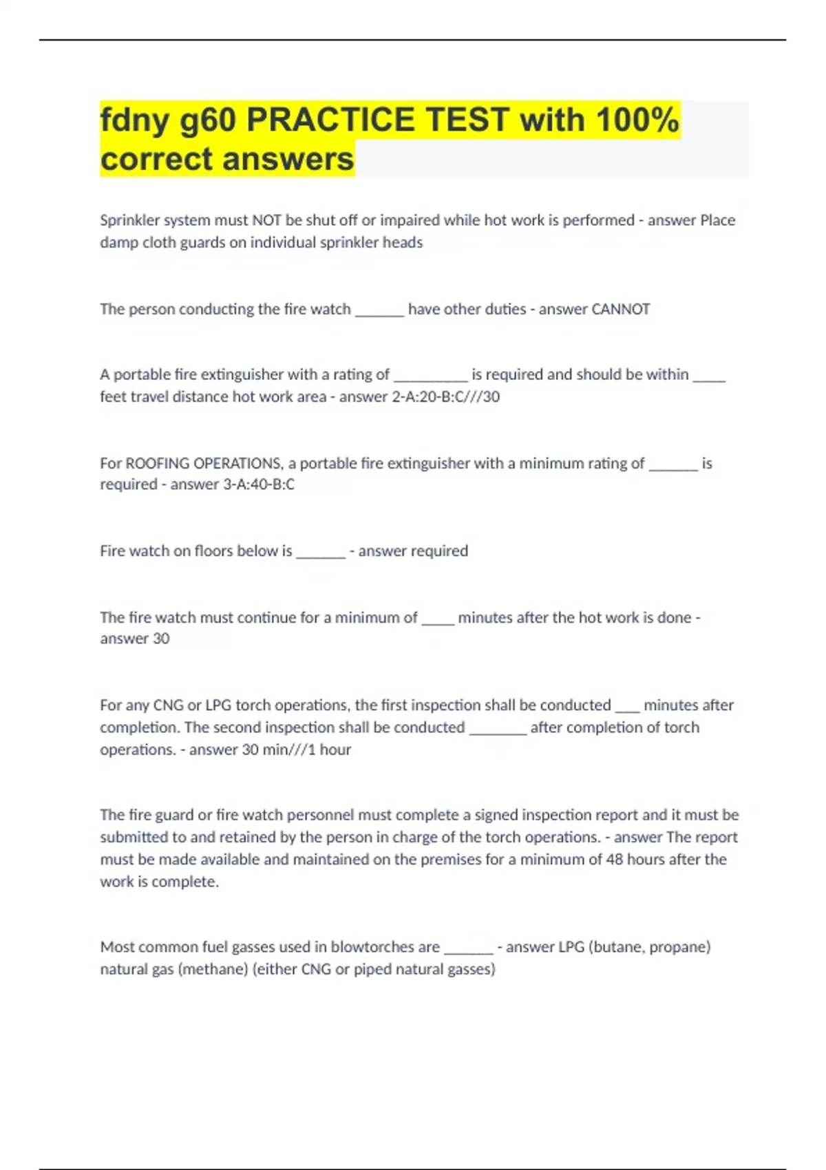 Sprinkler system must NOT be shut off or impaired while hot work is performed Place damp cloth guards on individual sprinkler heads The person conducting the fire watch ______ have other duties CANNOT A portable fire extinguisher with a rating of _________ is required and should be within ____ feet travel distance hot work area 2-A:20-B:C///30 For ROOFING OPERATIONS, a portable fire extinguisher with a minimum rating of ______ is required 3-A:40-B:C Fire watch on floors below is ______ required The fire watch must continue for a minimum of ____ minutes after the hot work is done 30 For any CNG or LPG torch operations, the first inspection shall be conducted ___ minutes after completion. The second inspection shall be conducted _______ after completion of torch operations. 30 min///1 hour The fire guard or fire watch personnel must complete a signed inspection report and it must be submitted to and retained by the person in charge of the torch operations. The report must be made available and maintained on the premises for a minimum of 48 hours after the work is complete. Most common fuel gasses used in blowtorches are ______ LPG (butane, propane) natural gas (methane) (either CNG or piped natural gasses) Soldering and brazing temperatures are typically______ 840 degrees F Oxy-acetylene generates the highest temperature which can reach up to _____ 6000 degrees F Gas torches can exceed _________ and are used for burning weeds, melting ice, or applying tar to a roof 2000 degrees F If the torch operation is to stop for a period of _________________, the torch vale must be closed and the gas supply to the torch must be completely shut 1 hour or more Containers, valves, regulators, hose and other apparatus and fittings for oxygen must be kept free of __________. oil or grease Backfire this occurs when the flame of a torch goes out and there is a loud snap or pop Flashback This occurs when the cutting or welding flame burns inside the torch or the hoses and it is usually accompanied by a whistle or hissing noise. As soon as it is noticed, the torch control valves should be closed. This indicated there is something wrong with the equipment, either damage or blockage A hot work area should be _____ well ventilated Whoever is working with hot work equipment CANNOT wear _____________ since it is susceptible to burning and ignition frayed clothing Empty containers must be __________ handled in the same manner as full ones Gas containers must be replaced when empty. It is ILLEGAL to refill gas container All gas containers, whether CNG or LPG, must be secured in an __________ upright position and must not be stacked or stored on shelves All gas containers and related equipment must be _________ protected from extreme temperature and physical damage The control valve of any gas container must be _______ opened by hand Acetylene valves shall not be opened more than ______ 1 ½ turns The purpose of a regulator is to ________ control the flow of gas and lower the pressure from the container to the appliance. It also acts like a safely barrier between the high pressure of the gas container and the end use appliance Hoses must be as _______ protecting from mechanical injury short as practical No hose is allowed to exceed ____feet 30 A compressed gas container MUST NOT ________ be rolled on its side or its rim, only by approved lifting equipment Ropes, chains or slings shall NOT be used to ________ suspend compressed gas containers unless such containers have been designed for such handling CNG and LPG containers must be located _______ away from electric power lines, piping containing flammable or combustible liquids, piping containing flammable gasses, and piping containing oxidizing materials Fuel gas or oxygen containers in storage must be separated from any combustible materials by a minimum distance of _____ 20 feet
