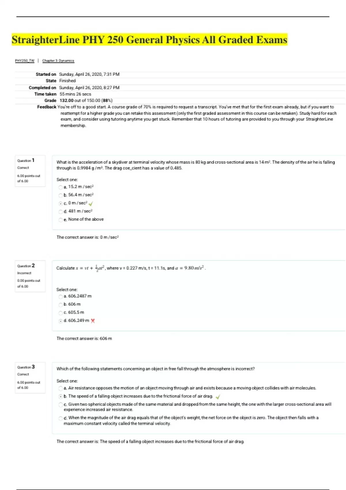 StraighterLine PHY 250 General Physics All Graded Exams PHY250_TW | Chapter 3: Dynamics Started on Sunday, April 26, 2020, 7:31 PM State Finished Completed on Sunday, April 26, 2020, 8:27 PM Time taken 55 mins 26 secs Grade 132.00 out of 150.00 (88%) Feedback You’re off to a good start. A course grade of 70% is required to request a transcript. You’ve met that for the first exam already, but if you want to reattempt for a higher grade you can retake this assessment (only the first graded assessment in this course can be retaken). Study hard for each exam, and consider using tutoring anytime you get stuck. Remember that 10 hours of tutoring are provided to you through your StraighterLine membership. The correct answer is: 0 m /sec2 The correct answer is: 606 m
