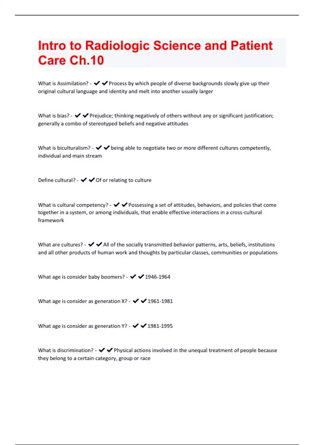 What is Assimilation? - Process by which people of diverse backgrounds slowly give up their original cultural language and identity and melt into another usually larger What is bias? - Prejudice; thinking negatively of others without any or significant justification; generally a combo of stereotyped beliefs and negative attitudes What is biculturalism? - being able to negotiate two or more different cultures competently, individual and main stream Define cultural? - Of or relating to culture What is cultural competency? - Possessing a set of attitudes, behaviors, and policies that come together in a system, or among individuals, that enable effective interactions in a cross-cultural framework What are cultures? - All of the socially transmitted behavior patterns, arts, beliefs, institutions and all other products of human work and thoughts by particular classes, communities or populations What age is consider baby boomers? - What age is consider as generation X? - What age is consider as generation Y? - What is discrimination? - Physical actions involved in the unequal treatment of people because they belong to a certain category, group or raceDefine diverse - Differing from one another; made up of distinct characteristics, qualities, or elements What is diversity? - Fact of quality of being diverse different (all of the the ways in which human beings are both similar and different) What is ethnic? - Designating any of the basic groups or divisions of humankind or of a heterogeneous population, as distinguished by customs, characteristics, language, and common history;national origin What is ethnicity? - Ethnic affiliation or classifcation What is ethnocentrism? - Tendency toward viewing the norms and values of the individuals own culture as absolute and using them as a standard against which all other cultures are measure Define gender - Chromosomal designation of female or male being What is gender role stereotyping? - Expectation of how people should behave solely base on whether they are male or female What is glass ceiling mean? - Precluded from being promoted to high-level positions because of their gender What is homophobia? - Irrational fear of and hostility toward homos What is human - People What is mental and physical abilities? - Capacity to perform cognitive and psycho-motor tasks