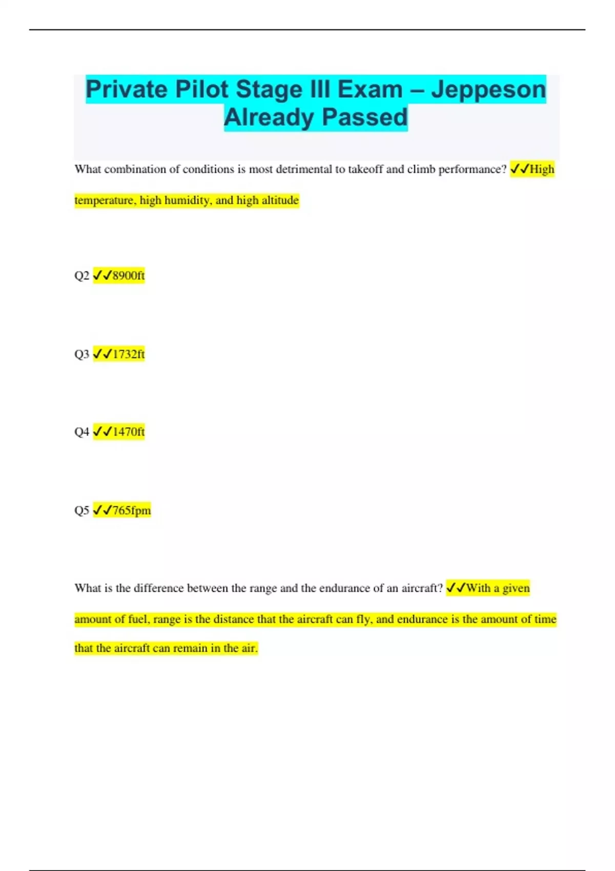 Private Pilot Stage III Exam – Jeppeson Already Passed What combination of conditions is most detrimental to takeoff and climb performance? High temperature, high humidity, and high altitude Q2 8900ft Q3 1732ft Q4 1470ft Q5 765fpm What is the difference between the range and the endurance of an aircraft? With a given amount of fuel, range is the distance that the aircraft can fly, and endurance is the amount of time that the aircraft can remain in the air. Center of gravity is defined as the theoretical point... where all of the aircraft's weight is considered to be concentrated One of the items included in the airplanes basic empty weight is... unusable fuel What is the CG location after the airplane is loaded with full fuel? ****** 42.66 inches (SUM Weight x Arm)/(SUM Weight) How much fuel can be carried in the aircraft without exceeding a maximum takeoff weight of 2700 lbs? 19.6 gallons (1 gallon = 6lbs) Total moment 113876.4 pound-inches Assume an aircraft has a total weight of 2,950 pounds and a total moment of 210,700 pound-inches. If the CG range is from 82.1 to 86.7 inches, what action, if any, should you take before you fly the aircraft? Move some load aft in the aircraft Q13 96.8 lb-inches Q14 Within normal category limits but outside utility category limits The time-speed-distance function of your flight computer can be used to solve for groundspeed and fuel consumption If your aircraft's fuel consumption rate is 5.6 g.p.h., how much fuel will it use on a flight of 230 n.m. with an average groundspeed of 93 knots? 13.8 gallons (Use E6-B) Determine the density altitude using the listed conditions 4097ft When you are flying an aircraft into a left-quartering headwind, what is the effect on groundspeed and wind correction angle if the wind velocity increases? Groundspeed decreases, and wind correction increases. If you plan to save 30 minutes fuel for reserve, how far can you fly based on the listed conditions? 655 miles (Calculate total time first, then Calculate GS, then calculate distance) Compute the true heading and groundspeed for a cross-country flight based on the listed conditions 185 degrees and 106 knots Q21 113 knots Q22 30 degrees Q23******* 12.2 gallons Q24 193 degrees Q25 4 degrees 45' E Q26 1hour and 10min (GET GS) To convert True Heading to Magnetic Heading you need to... (TH = MC)***** subtract easterly or add westerly vartion, determined from the isogonic lines on the chart For a night cross-country flight, you are required by the FARs to carry enough fuel, considering wind and forecast weather, to complete the flight to the first point of intended landing and fly after that for at least 45 minutes at normal cruise speed The "R" block 3 of the flight plan means the airplane has RNAV and a transponder with altitude encoding capability How will the flight plan be affected if itis not opened, or activated, until 2030Z? The FSS will cancel the flight plan automatically if it is not opened within on hour of the proposed departure time Assuming the actual departure time was 1930Z, at what time will ATC begin a telephone search if the flight plan has not been closed? 2240Z If you have several cruising altitudes selected for a flight, how are they entered in block 7? List only the first altitude The primary disadvantage of VOR navigation is the line-of-sight reception characteristic Q34 #4 OFF Q35 300 Degrees Q36 #3 From Assume that you are flying outbound from a VOR station on the 120 degree radial and inbound to the next station on the 300 radial. If the course selector is set at 120 degrees, what TO/FROM indication will be displayed when you change the frequency to the station ahead? To While you are tracking a VOR radial, what factor causes the most difference between the selected course and the magnetic heading? Wind What are the main GPS segment(s)? What part of your eye allows you to perceive color? Cones While allowing your eyes to adapt to darkness for a night flight, you should avoid bright white lights, such as headlights, landing lights, strobe lights, and flash lights for at least thirty minutes before flight The best way to view dim objects at night is to use off-center viewing and avoid staring at the object for too long When flying a VFR approach at night there is a natural tendency to use a lower-than-normal Assume you feel a tumbling or spinning sensation during climbout after a night departure. In this situation, you should rely on the flight instruments and believe what they tell you The best way to overcome the effects of hypoxia is to use supplemental oxygen One potential cause of hyperventilation is stress What type of hazardous attitude is represented by the statement, "It won't happen to me," and what is the appropriate antidote? Invulnerability, and "It could happen to me." The "I'm Safe" Checklist provides a self-assessment of your safety as a pilot What are the six skills associated with single-pilot resource management (SRM)? You reach the halfway point on a VFR cross-country flight and an event occurs that requires you to make a decision. What is an example of the first step in the ADM process? You recieve a landing clearance and line up on short final. Yout flight instructor offers a critique about your traffic pattern entry. Which statement regarding sterile cockpit is correct? Private Pilots are strongly recommended to follow sterile cockpit procedure to increase safety, asking passengers to defer questions or conversations during high workload times Q52 Q53
