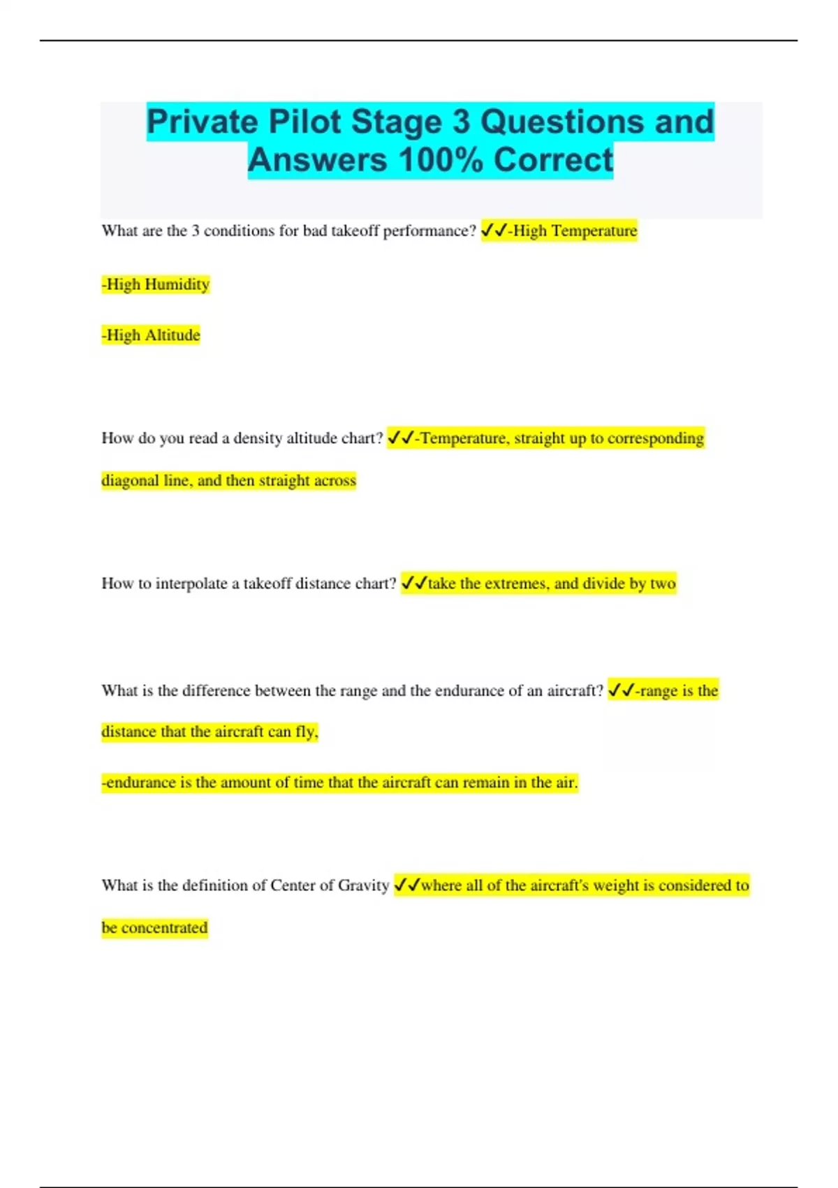 Private Pilot Stage 3 Questions and Answers 100% Correct What are the 3 conditions for bad takeoff performance? -High Temperature -High Humidity -High Altitude How do you read a density altitude chart? -Temperature, straight up to corresponding diagonal line, and then straight across How to interpolate a takeoff distance chart? take the extremes, and divide by two What is the difference between the range and the endurance of an aircraft? -range is the distance that the aircraft can fly, -endurance is the amount of time that the aircraft can remain in the air. What is the definition of Center of Gravity where all of the aircraft's weight is considered to be concentrated What is included in basic empty weight? -Oil -Coolant -Unusable fuel What formula determine weight and balence? Arm X lbs = Moment How to find total arm Total moment / total weight How much does gas weigh per gallon? 6 lbs per gallon How to interpolate max takeoff weight (Total weight - Max Gross Weight)/6 How to find moment on weight and balance chart -find weight of each object separately -go across to diagonal line -go straight down -add moments up What is the Time, Speed, and distance used for on your E6B? Groundspeed and fuel consumption How to find density altitude on E6B -Find pressure altitude and temperature -Match them on the +- 50 thing w/ temp on outside read density altitude When you are flying an aircraft into a left-quartering headwind, what is the effect on groundspeed and wind correction angle if the wind velocity increases? Groundspeed decreases, and wind correction increases. How to convert CS to TS on E6B -Line up temp and pressure altitude -Read TAS on outside, CAS on inside How to use a plotter -Line up where you are with where you want to go -Find a longitudinal line -Keeping the angle of the plotter, move it until the middle intersects with a line of longitude How to calculate fuel remaining -Place arrow on fuel burn per hour -Find fuel on back scale -Read fuel remaining on moving scale How to find compass heading -Find course using plotter -Do wind problem to find wind correction angle -Add wind correction angle to course -Use purple dashed lines to determine magnetic heading -Add/subtract deviation in compass How to find magnetic variation Look at purple dashed lines and add or subtract it from true heading Using the partially completed navigation log, determine the time required to fly the distance from the bridge to the destination 1 hour, 10 minutes How do you convert TH to MH? TH +- Var = MH For a night cross-country flight, you are required by the FARs to carry enough fuel, considering wind and forecast weather, to complete the flight to 45 minutes past what you need to land How long are flight plans good for before taking off? 1 hr When do they look for you if you don't close your flight plan? 30 min after landing what part of your eye allows you to see color Cones While allowing your eyes to adapt to darkness for a night flight, you should avoid bright white lights at least thirty minutes before flight The best way to view dim objects at night is to use off-center viewing and avoid staring at the object for too long When flying a VFR approach at night there is a natural tendency to use a Lower than normal approach Assume you feel a tumbling or spinning sensation during climbout after a night departure. In this situation, you should rely on the flight instruments and believe what they tell you The best way to overcome the effects of hypoxia is to use supplemental oxygen One of the things that can cause hyperventilation is stress What type of hazardous attitude is represented by the statement, "It won't happen to me," and what is the appropriate antidote? Invulnerability, and "It could happen to me." The "I'm Safe" Checklist provides a self-assessment of your safety as a pilot To maximize your communication effectiveness, you should repeat them back The key concepts of effective workload management are Use proper planning