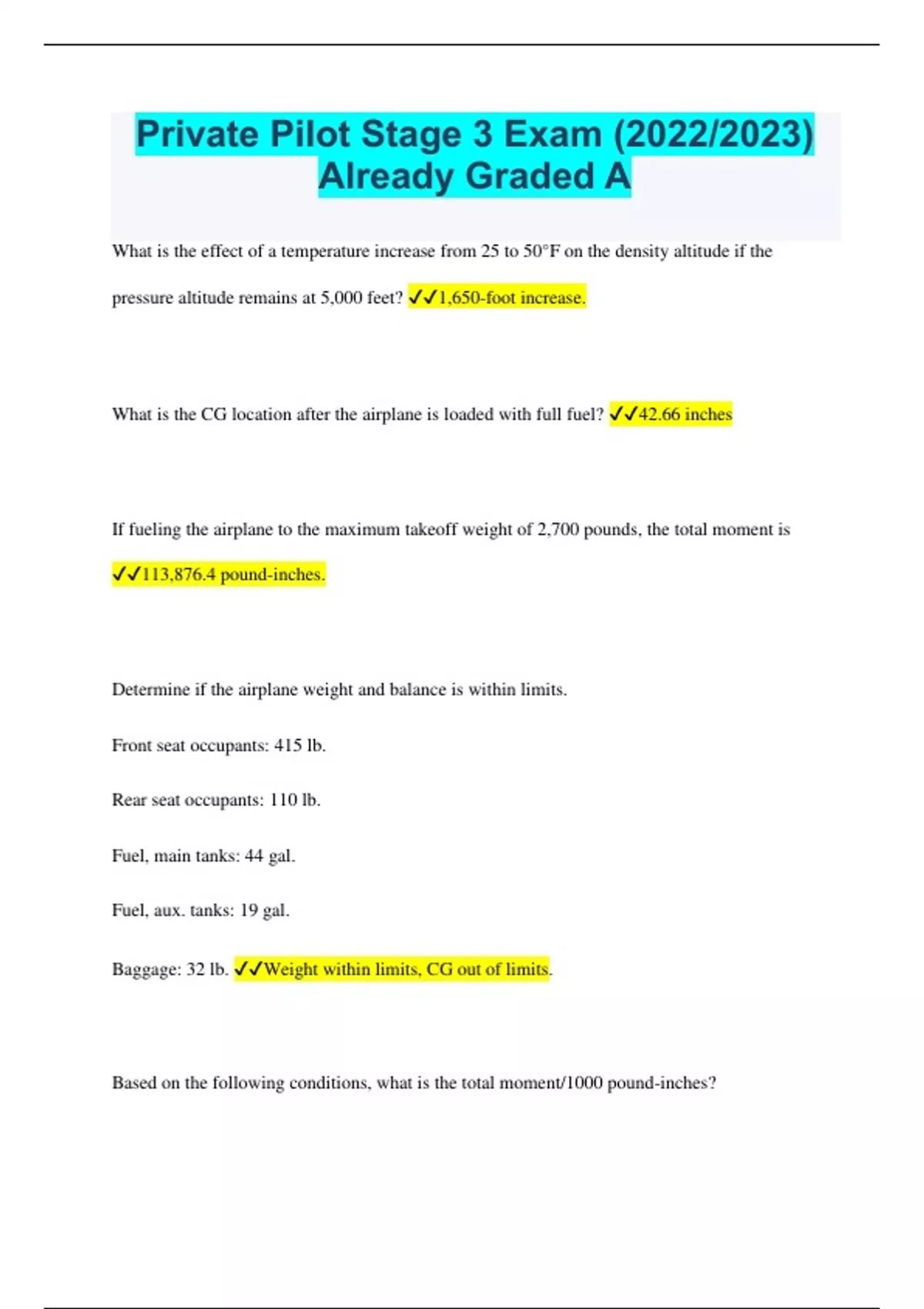 Private Pilot Stage 3 Exam (2022/2023) Already Graded A What is the effect of a temperature increase from 25 to 50°F on the density altitude if the pressure altitude remains at 5,000 feet? 1,650-foot increase. What is the CG location after the airplane is loaded with full fuel? 42.66 inches If fueling the airplane to the maximum takeoff weight of 2,700 pounds, the total moment is 113,876.4 pound-inches. Determine if the airplane weight and balance is within limits. Front seat occupants: 415 lb. Rear seat occupants: 110 lb. Fuel, main tanks: 44 gal. Fuel, aux. tanks: 19 gal. Baggage: 32 lb. Weight within limits, CG out of limits. Based on the following conditions, what is the total moment/1000 pound-inches? Empty weight: 1,467 lb. Empty moment/1000: 57.3 pound-inches Pilot and front passenger: 300 lb. Rear seat passenger: 100 lb. Baggage area 1: 100 lb. Fuel: 40 gal. 96.8 Calculate the moment of the airplane and determine which category is applicable.: Empty weight: 1,350 lb. Empty moment/1000: 51.5 Pilot and front passenger: 310 lb. Rear passenger: 96 lb. Fuel: 38 gal. Oil: 8 qt. 80.8, utility category. The weight of the loaded aircraft is 2,207 pounds and the moment/1000 is 96.8 pound-inches. According to the center of gravity moment envelope, the aircraft's CG is within normal category limits but outside utility category limits. What is the expected fuel consumption for a 1,000-nautical mile flight under the following conditions? Pressure altitude: 8,000 ft. Temperature: 22°C Manifold pressure: 20.8 in. Hg. Wind: Calm 70.1 gallons. What fuel flow should a pilot expect at 11,000 feet on a standard day with 65 percent maximum continuous power? 11.2 gallons per hour. Determine the approximate total distance required to land over a 50-foot obstacle. OAT: 90°F Pressure altitude: 4,000 ft. Weight: 2,800 lb. Headwind component: 10 kt. 1,775 feet. Determine the total distance required to land over a 50-foot obstacle. Pressure altitude: 7,500 ft. Headwind: 8 kt. Temperature: 32°F Runway: Hard surface 1,004 feet. Large accumulations of carbon monoxide in the human body result in loss of muscular power. If you have several cruising altitudes selected for a flight, how are they entered in block 7? List only the first altitude. What is the difference between the range and the endurance of an aircraft? With a given amount of fuel, range is the distance that the aircraft can fly, and endurance is the amount of time that the aircraft can remain in the air. If airplane B has 280° set in the course selector, the VOR indications will correspond to those of instrument 3 What part of your eye allows you to perceive color? Cones. While allowing your eyes to adapt to darkness for a night flight, you should avoid bright white lights, such as headlights, landing lights, strobe lights, and flash lights for at least thirty minutes before flight. The best method to use when looking for other traffic at night is to look to the side of the object and scan slowly. VFR approaches to land at night should be accomplished the same as during daytime. If a pilot experiences spatial disorientation during flight in a restricted visibility condition, the best way to overcome the effect is to rely upon the aircraft instrument indications. Which statement best defines hypoxia? A state of oxygen deficiency in the body. When a stressful situation is encountered in flight, an abnormal increase in the volume of air breathed in and out can cause a condition known as hyperventilation. What is the antidote when a pilot has a hazardous attitude, such as "Antiauthority"? Follow the rules. The 'I'm Safe' Checklist provides a self-assessment of your safety as a pilot. Risk management, as part of the aeronautical decision making (ADM) process, relies on which features to reduce the risks associated with each flight? Situational awareness, problem recognition, and good judgment. What is one of the neglected items when a pilot relies on short and long term memory for repetitive tasks? Checklists. For a night cross-country flight, you are required by the FARs to carry enough fuel, considering wind and forecast weather, to complete the flight to the first point of intended landing and fly after that for at least 45 minutes at normal cruise speed. If airplane A has 090° set in the course selector, its VOR indications will correspond to those of instrument 4 (Illustration 3) The VOR receiver has the indications shown. What is the aircraft's position relative to the station? Southeast How should a VFR flight plan be closed at the completion of the flight at a controlled airport? The pilot must close the flight plan with the nearest FSS or other FAA facility upon landing. What magnetic bearing should the pilot use to fly TO the station? 210 Determine the total distance required for takeoff to clear a 50-foot obstacle. OAT: Standard Pressure altitude: Sea level Takeoff weight: 2,700 lb. Headwind component: Calm 1,400 feet. One of the items included in an aircraft's basic empty weight is unusable fuel. Which combination of atmospheric conditions will reduce aircraft takeoff and climb performance? High temperature, high relative humidity, and high density altitude. How much fuel can be carried in the aircraft without exceeding a maximum takeoff weight of 2,700 pounds? 19.6 gallons Determine the magnetic course from First Flight Airport (area 5) to Hampton Roads Airport (area 2). 331 Using the partially completed navigation log, determine the time required to fly the distance from the bridge to the destination. 1 hour, 10 minutes The primary disadvantage of VOR navigation is the line-of-sight reception characteristic. What is the estimated time en route from Mercer County Regional Airport (area 3) to Minot International (area 1)? The wind is from 330° at 25 knots and the true airspeed is 100 knots. Add 3-1/2 minutes for departure and climb-out. 48 minutes Determine the magnetic heading for a flight from Mercer County Regional Airport (area 3) 