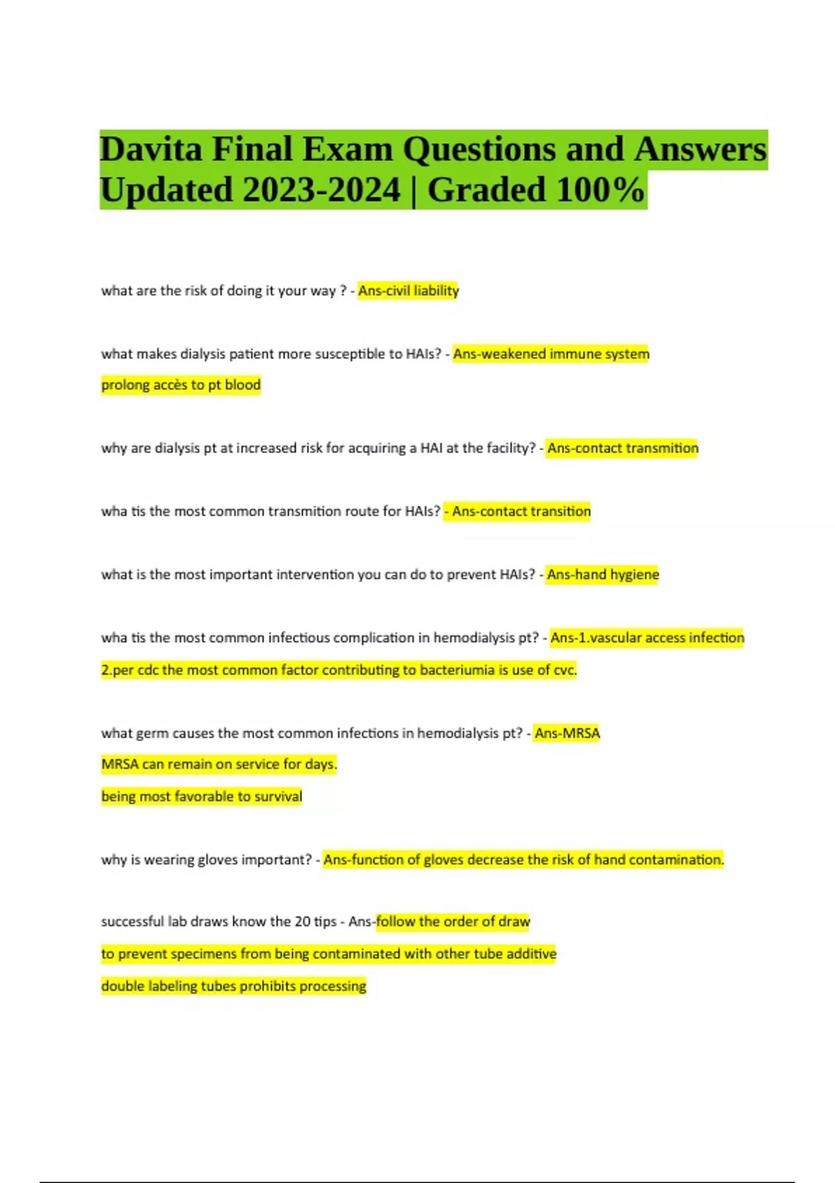 Davita Exam Practice Questions and Answers - Latest Updated 2023/2024. wha tis the most common transmition route for HAIs? - Ans-contact transition what is the most important intervention you can do to prevent HAIs? - Ans-hand hygiene wha tis the most common infectious complication in hemodialysis pt? - Alar access infection cdc the most common factor contributing to bacteriumia is use of cvc. what germ causes the most common infections in hemodialysis pt? - Ans-MRSA MRSA can remain on service for days. being most favorable to survival why is wearing gloves important? - Ans-function of gloves decrease the risk of hand contamination. successful lab draws know the 20 tips - Ans-follow the order of draw to prevent specimens from being contaminated with other tube additive double labeling tubes prohibits processing Davita Final Exam Questions and Answers Updated | Graded 100% what is rule of spinning samples? - Ans-balance, spin tubes of same kind size fill level and should be placed opposite of each other. what are signs and symptoms of hyperkalemia - Ans-high potassuim-muscle weakness, abnormal heart rate what are signs and symptoms of hypokalemia - Ans-low potassium-muscle cramp abnormal heart rate cold how can you prevent contributing to blood loss? - Ate heparinzation giving heprin why are patients anemic ? - Ans-lack of (ego)erythropoietin what is pericarditis? what is included in its treatment ? - Ans-no heparin hold or decrease heparin peripheral neuropathy - Ans-check temperature of bathwater don't walk bare feet frequent foot check what are the 4 key elements affected in CKD-MBD? - Aum horous hyroid hormone nt D what does the acronym DARN stand for? - Ans-desire ability reason need when should the communication style directing be used? - Ans-when training to perform procedure what are the 3 core communication skills to be used within the communication styles - Ans-asking, lisening,involving