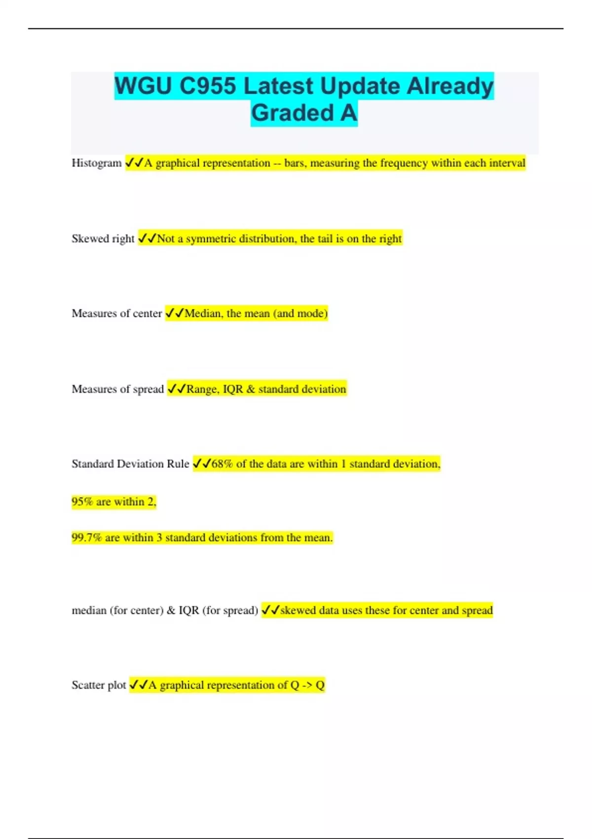 WGU C955 Latest Update Already Graded A Histogram A graphical representation -- bars, measuring the frequency within each interval Skewed right Not a symmetric distribution, the tail is on the right Measures of center Median, the mean (and mode) Measures of spread Range, IQR & standard deviation Standard Deviation Rule 68% of the data are within 1 standard deviation, 95% are within 2, 99.7% are within 3 standard deviations from the mean. median (for center) & IQR (for spread) skewed data uses these for center and spread Scatter plot A graphical representation of Q -> Q Two way table A graphical representation of C -> C Side-by side box A graphical representation of C -> Q Interpolation Making predictions *within* the range of your data. This is usually accurate. Extrapolation Making predictions *outside* of the range of your data. This is generally a bad idea. Simpson's Paradox When split up, each data set can have a pattern which goes away when all the data is combined. Prospective study Is a study that's done over time to find results / A study watching for outcomes during the study period Unbalanced response Giving more options that are negative than positive options (or vice versa) which biases the responses towards the more common option Matched pairs Grouping two similar subjects and giving different treatments/procedures to each in order to compare the differences. For example, having one twin take a medication while the other twin does not. Population The entire group you are trying to describe or understand. Sampling frame List of group from which you choose your sample. Sample The group that is actually picked to be included in a study Simple random sample making a selection by following a random pattern and selecting without replacement. Unbiased. Systematic sample Sample is selected by listing the sampling frame, then making a selection by following a simple pattern (eg. Every 20th name). Unbiased. Voluntary sample Members of the sample may choose not to respond. Similar to Non Response. Convenience sample Participants are easy for researcher to access. Tends to increase bias. Cluster sample Sample frame is divided into groups, we select a few groups, then selecting ALL of the members of those groups. Stratified sample Sample frame is divided into groups. Then we choose a random sample (usually the same size) from within EVERY group. Multi-stage sample Multiple rounds of randomness and grouping. For example: randomly selecting a few groups, then choosing a small random sample just those selected groups. Often a combination of Cluster and Stratified Sampling. P(A)*P(B) independent events: P(A and B) = P(A|B) P(A and B) ÷ P(B) P(A or B) P(A) + P(B) - P(A and B) P(A and B) P(A)*P(B|A) Box plot an image that has 5 number summary: min, Q1, median, Q3, max, nCr = n! / r!(n - r)! probability combination formula