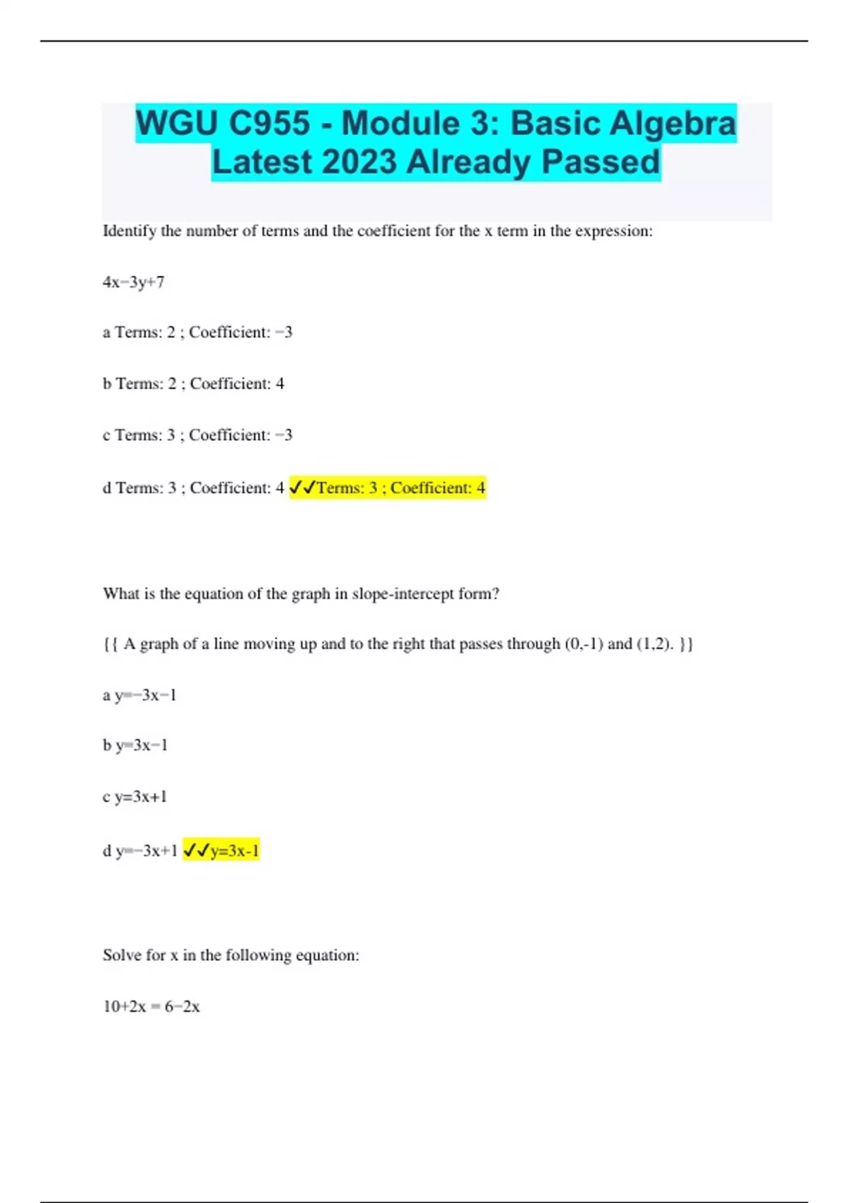 WGU C955 - Module 3: Basic Algebra Latest 2023 Already Passed Identify the number of terms and the coefficient for the x term in the expression: 4x−3y+7 a Terms: 2 ; Coefficient: −3 b Terms: 2 ; Coefficient: 4 c Terms: 3 ; Coefficient: −3 d Terms: 3 ; Coefficient: 4 Terms: 3 ; Coefficient: 4 What is the equation of the graph in slope-intercept form? {{ A graph of a line moving up and to the right that passes through (0,-1) and (1,2). }} a y=−3x−1 b y=3x−1 c y=3x+1 d y=−3x+1 y=3x-1 Solve for x in the following equation: 10+2x = 6−2x a −4 b −1 c 1 d 4 -1 Solve for x in the following inequality: x < -4 a x>−4 b x<−4 c x>−1 d x<−1 x<-4 Please simplify the expression with a fraction: 1/3(9x−3) a 3x−1 b 3x−3 c 9x−1 d 9x−3 3x-1 Simplify the expression: 3x(2x+3y−4) a 6x^2+3y−12x b 6x^2+3y−4 c 6x^2+9xy−4 d 6x^
