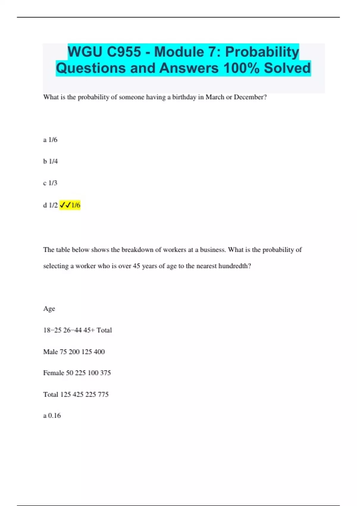 WGU C955 - Module 7: Probability Questions and Answers 100% Solved What is the probability of someone having a birthday in March or December? a 1/6 b 1/4 c 1/3 d 1/2 1/6 The table below shows the breakdown of workers at a business. What is the probability of selecting a worker who is over 45 years of age to the nearest hundredth? Age 18−25 26−44 45+ Total Male Female Total a 0.16 b 0.29 c 0.42 d 0.55 0.29 The table below shows the breakdown of workers at a business. What is the probability that a randomly selected 18−25 year old is male (to the nearest hundredth)? Age 18−25 26−44 45+ Total Male Female Total a 0.48 b 0.52 c 0.56 d 0.60 0.60 The probability that Jimmy attends school on any given day is 0.98 . The probability Jimmy misses a day of school, given that he missed the day before, is 0.5 . What is the probability that Jimmy misses school on BOTH Tuesday and Wednesday? a 0.0004 b 0.01 c 0.02 d 0.04 0.01 The following table shows the percentage of events at an arena. Basketball 26% Hockey 19% Concert 18% Table Tennis 9% Other 28% What is the disjoint probability of having a basketball or hockey game at the arena? a 27%