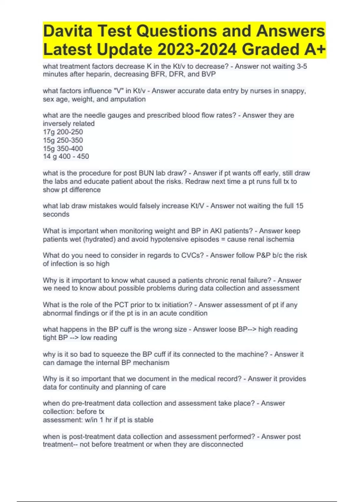 Davita Final Exam Questions and Answers - Latest Update (Verified Answers). what is the procedure for post BUN lab draw? - Answer if pt wants off early, still draw the labs and educate patient about the risks. Redraw next time a pt runs full tx to show pt difference what lab draw mistakes would falsely increase Kt/V - Answer not waiting the full 15 seconds What is important when monitoring weight and BP in AKI patients? - Answer keep patients wet (hydrated) and avoid hypotensive episodes = cause renal ischemia What do you need to consider in regards to CVCs? - Answer follow P&P b/c the risk of infection is so high Why is it important to know what caused a patients chronic renal failure? - Answer we need to know about possible problems during data collection and assessment What is the role of the PCT prior to tx initiation? - Answer assessment of pt if any abnormal findings or if the pt is in an acute condition what happens in the BP cuff is the wrong size - Answer loose BP--> high reading tight BP --> low reading why is it so bad to squeeze the BP cuff if its connected to the machine? - Answer it can damage the internal BP mechanism Why is it so important that we document in the medical record? - Answer it provides data for continuity and planning of care when do pre-treatment data collection and assessment take place? - Answer collection: before tx assessment: w/in 1 hr if pt is stable when is post-treatment data collection and assessment performed? - Answer post treatment-- not before treatment or when they are disconnected what are the consequences of poor or incomplete documentation - Answer can open attack on your care What are the six items needed in charting meds? - Answer 1. med/dosage 2. date/time 3. route 4. reason (remember this!) 5. pt response 6. signature What are the 5 Ws to be used when completing an AOR? - Answer who what when where why how What are the 4 consequences of sodium loading during dialysis? - Answer 1. increased thirst 2. increased fluid intake 3. increased intradialytic weight gain = htn 4. increased UFR what is the purpose of UF profiling? - Answer change the way fluid is remodeled during the tx and allows for vascular refilling what are the consequences of hypovolemia during tx? - Answer attempting to remove a lot of fluid --> hypovolemia during tx --> loss of renal function, ischemia, and increased mortality rate what must the machine's conductivity and pH reading supposed to be? - Answer machine and manual conductivity: w/in +/-0.4 pH range: 6.9 - 7.6, measured to verify acid/base balance is in acceptable range at what temperature does hemolysis occur? - Answer 42 degrees C What do we do in a power outage? - Answer remove venous line from air detector, clamp, before starting hand crank and be diligent in watching for air in blood lines what causes a high venous pressure alarm? - Answer kink in tubing, clotting in venous drip chamber, infiltration, venous stenosis what are the risks of doing things "your way" and not the P&P way? - Answer it can lead to civil liabiliy what makes dialysis pts more susceptible to healthcare acquired infections? - Answer prolonged access to pts blood, and immunocompramised why are dialysis pts at an increased risk for acquiring HAIs at the facility? - Answer contact transmission what is the most common transmission route for HAIs - Answer contact transmission--> hands what is the most important invention you can do to prevent HAIs? - Answer handwashing what is the most common infectious complication in hemodialyisis pts? - Answer per the CDC, the most common factor contributing to bacteremia is use of CVCs What germ causes the most common infections in hemodialysis pts? - Answer MRSA which can remain on surfaces for days w/ plastic vinyl being most favorable to their survival why is wearing gloves so important? - Answer decrease risk of hand contamination and prevent transfer of organisms already on hands what is the correct procedure in regards to your hands when you have causal contact w/ a pt - Answer no gloves but must perform hand hygiene before care on pts Successful lab draw must knows - Answer follow order the lab draws to prevent specimen from being contaminated w/ other tube additives, double labeling tubes prohibits processing rules for spinning samples - Answer only spin tube of some kind of size and fill level and should be placed opposite of each other What are the symptoms of hyperkalemia? - Answer extreme muscle weakness abnormal HR, cardiac arrest what are the symptoms of hypokalemia? - Answer fatigue, muscle weakness, respiratory failure what is the primary cause of erythropoietin? - Answer primary cause how can you prevent contributing to blood loss? - Answer --adequate heperanization --ensure epo given -- completely rinse back blood --avoid repeat lab draws what is pericarditis? what is included in its treatment? - Answer w/ dialysis hold or decrease heparin systemic effects of CRF what should you do for a pt that complains of dry, itchy skin - Answer use hyperfatted soaps and lotions what should you do for a pt that complains of peripheral neuropathy? - Answer educate pt not to walk barefoot, frequent foot checks, check temp of bathwater What are the four key elements affected in CKD-MBD - Answer Ca2+ PO4 parathyroid hormone vitamin D what are the symptoms of CKD-MBD in addition to bone disease? - Answer softtissue calcification what is the best way to help pts successfully change behaviors? - Answer inspire behavior change through support, compassion, and empathy What does DARN stand for? - Answer desire, ability, reason, need FYI from Meghan: know the questions at the end of the motivational interviewing hand out (one of the PCTs at Red Hawk told me this_) - Answer fyi when should the communication style "directing" be used? - Answer best used when training to perform procedures what are the three core communication skills to be used w/in the communication style? - Answer asking listening informing wha