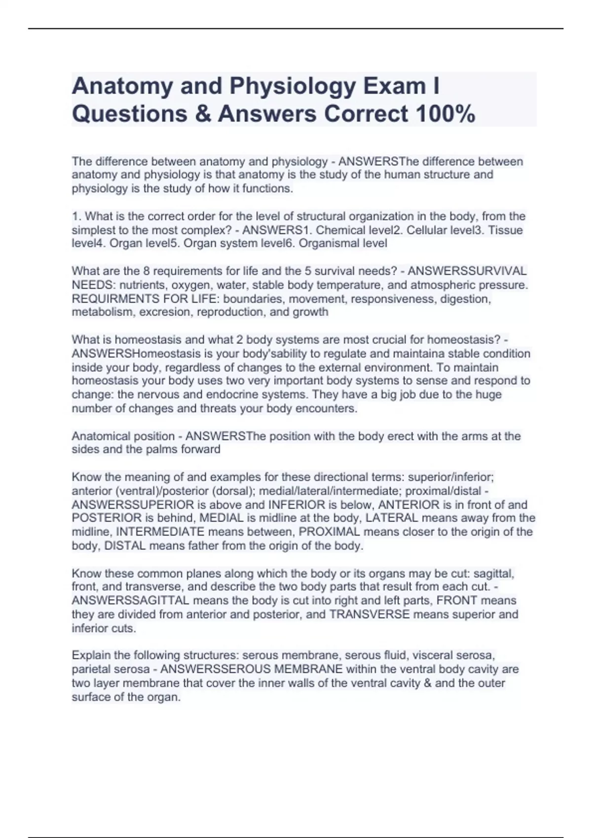 The difference between anatomy and physiology - ANSWERSThe difference between anatomy and physiology is that anatomy is the study of the human structure and physiology is the study of how it functions. 1. What is the correct order for the level of structural organization in the body, from the simplest to the most complex? - ANSWERS1. Chemical level2. Cellular level3. Tissue level4. Organ level5. Organ system level6. Organismal level What are the 8 requirements for life and the 5 survival needs? - ANSWERSSURVIVAL NEEDS: nutrients, oxygen, water, stable body temperature, and atmospheric pressure. REQUIRMENTS FOR LIFE: boundaries, movement, responsiveness, digestion, metabolism, excresion, reproduction, and growth What is homeostasis and what 2 body systems are most crucial for homeostasis? - ANSWERSHomeostasis is your body'sability to regulate and maintaina stable condition inside your body, regardless of changes to the external environment. To maintain homeostasis your body uses two very important body systems to sense and respond to change: the nervous and endocrine systems. They have a big job due to the huge number of changes and threats your body encounters. Anatomical position - ANSWERSThe position with the body erect with the arms at the sides and the palms forward Know the meaning of and examples for these directional terms: superior/inferior; anterior (ventral)/posterior (dorsal); medial/lateral/intermediate; proximal/distal - ANSWERSSUPERIOR is above and INFERIOR is below, ANTERIOR is in front of and POSTERIOR is behind, MEDIAL is midline at the body, LATERAL means away from the midline, INTERMEDIATE means between, PROXIMAL means closer to the origin of the body, DISTAL means father from the origin of the body. Know these common planes along which the body or its organs may be cut: sagittal, front, and transverse, and describe the two body parts that result from each cut. - ANSWERSSAGITTAL means the body is cut into right and left parts, FRONT means they are divided from anterior and posterior, and TRANSVERSE means superior and inferior cuts. Explain the following structures: serous membrane, serous fluid, visceral serosa, pa