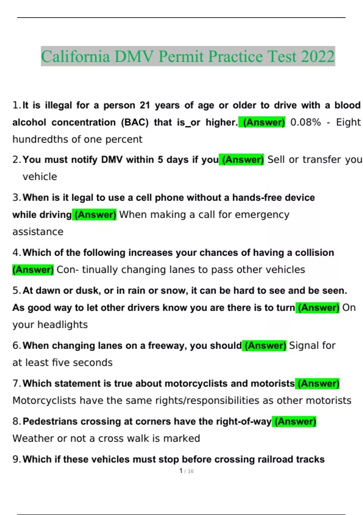 California DMV Permit Practice Test Questions and Answers