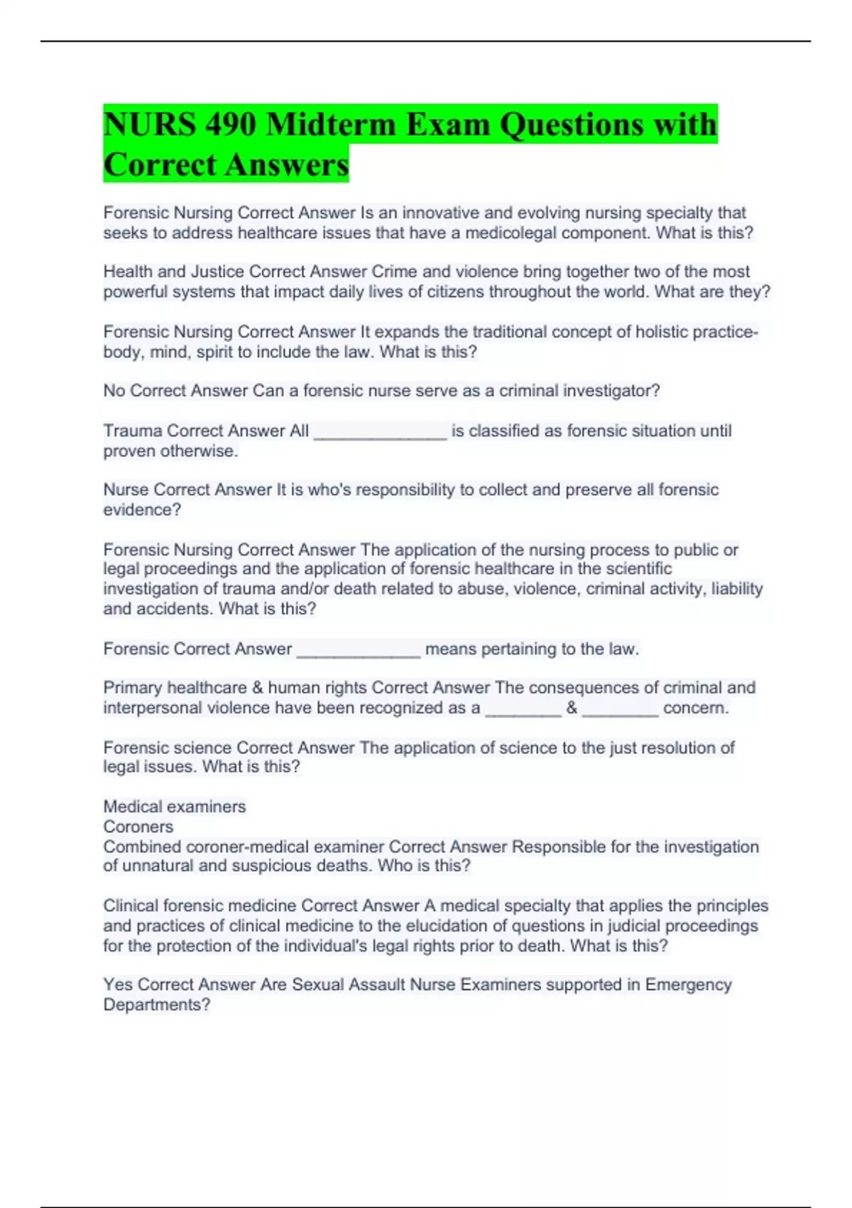 Forensic Nursing Correct Answer Is an innovative and evolving nursing specialty that seeks to address healthcare issues that have a medicolegal component. What is this? Health and Justice Correct Answer Crime and violence bring together two of the most powerful systems that impact daily lives of citizens throughout the world. What are they? Forensic Nursing Correct Answer It expands the traditional concept of holistic practice-body, mind, spirit to include the law. What is this? No Correct Answer Can a forensic nurse serve as a criminal investigator? Trauma Correct Answer All ______________ is classified as forensic situation until proven otherwise. Nurse Correct Answer It is who's responsibility to collect and preserve all forensic evidence? Forensic Nursing Correct Answer The application of the nursing process to public or legal proceedings and the application of forensic healthcare in the scientific investigation of trauma and/or death related to abuse, violence, criminal activity, liability and accidents. What is this? Forensic Correct Answer _____________ means pertaining to the law. Primary healthcare & human rights Correct Answer The consequences of criminal and interpersonal violence have been recognized as a ________ & ________ concern. Forensic science Correct Answer The application of science to the just resolution of legal issues. What is this? Medical examiners Coroners Combined coroner-medical examiner Correct Answer Responsible for the investigation of unnatural and suspicious deaths. Who is this? Clinical forensic medicine Correct Answer A medical specialty that applies the principles and practices of clinical medicine to the elucidation of questions in judicial proceedings for the protection of the individual's legal rights prior to death. What is this? Yes Correct Answer Are Sexual Assault Nurse Examiners supported in Emergency Departments?