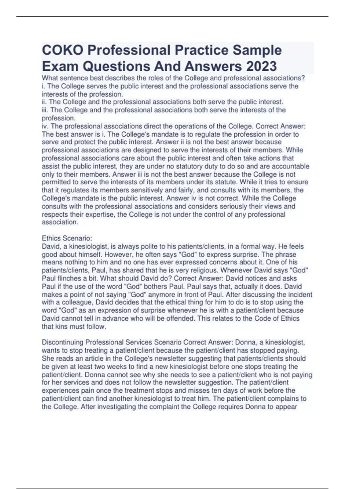 COKO Professional Practice Sample Exam Questions And Answers 2023
