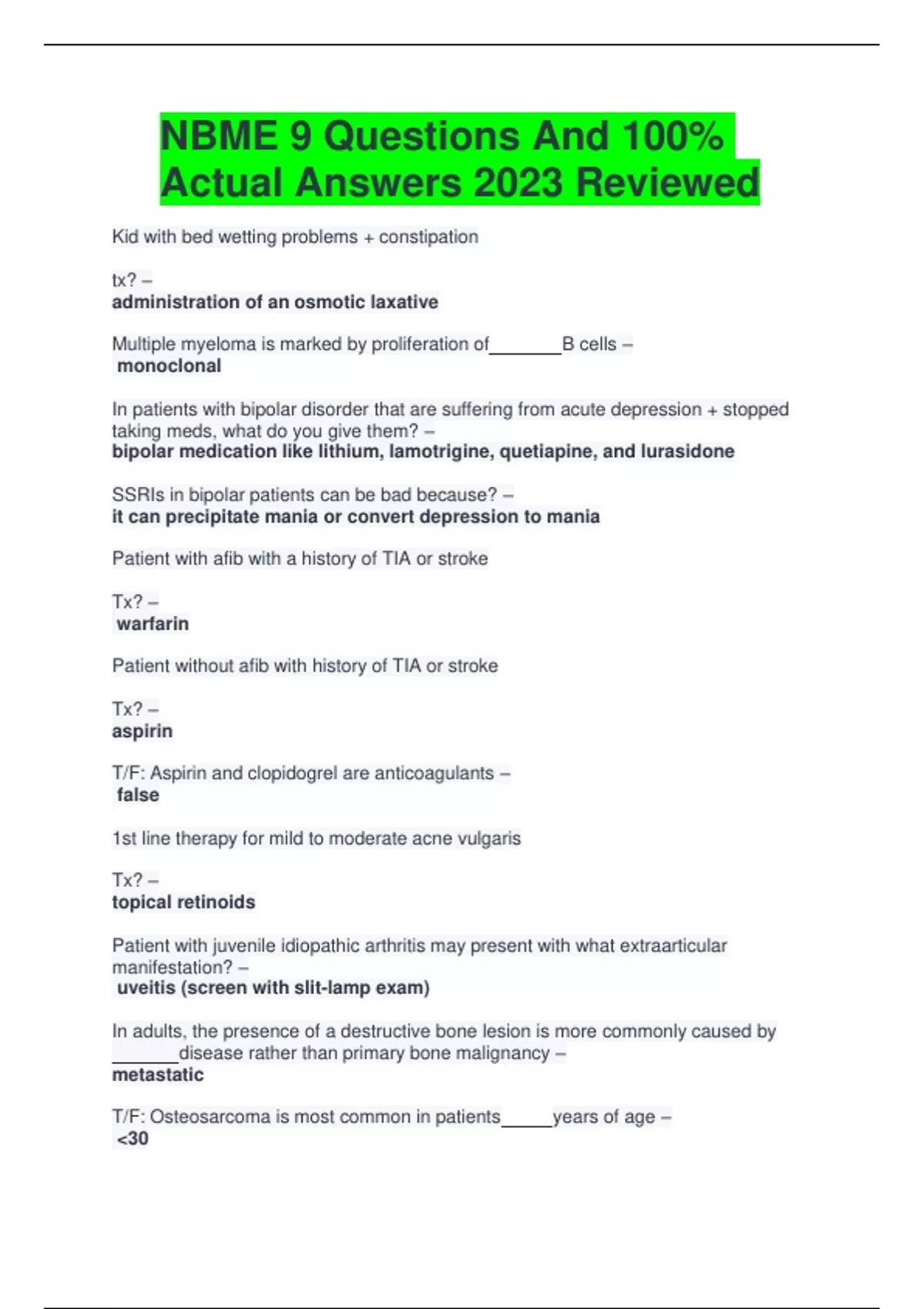 NBME 9 Questions And 100% Actual Answers 2023 Reviewed