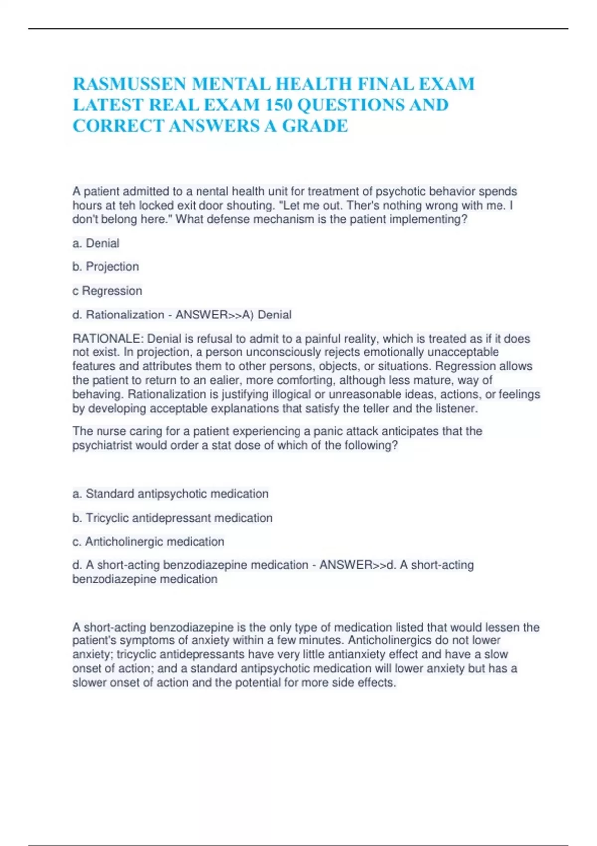 RASMUSSEN MENTAL HEALTH FINAL EXAM LATEST REAL EXAM 150 QUESTIONS AND CORRECT