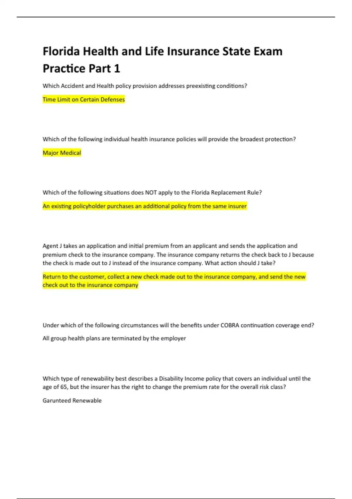 Which Accident and Health policy provision addresses preexisting conditions? Time Limit on Certain Defenses Which of the following individual health insurance policies will provide the broadest protection? Major Medical Which of the following situations does NOT apply to the Florida Replacement Rule? An existing policyholder purchases an additional policy from the same insurer Agent J takes an application and initial premium from an applicant and sends the application and premium check to the insurance company. The insurance company returns the check back to J because the check is made out to J instead of the insurance company. What action should J take? Return to the customer, collect a new check made out to the insurance company, and send the new check out to the insurance company