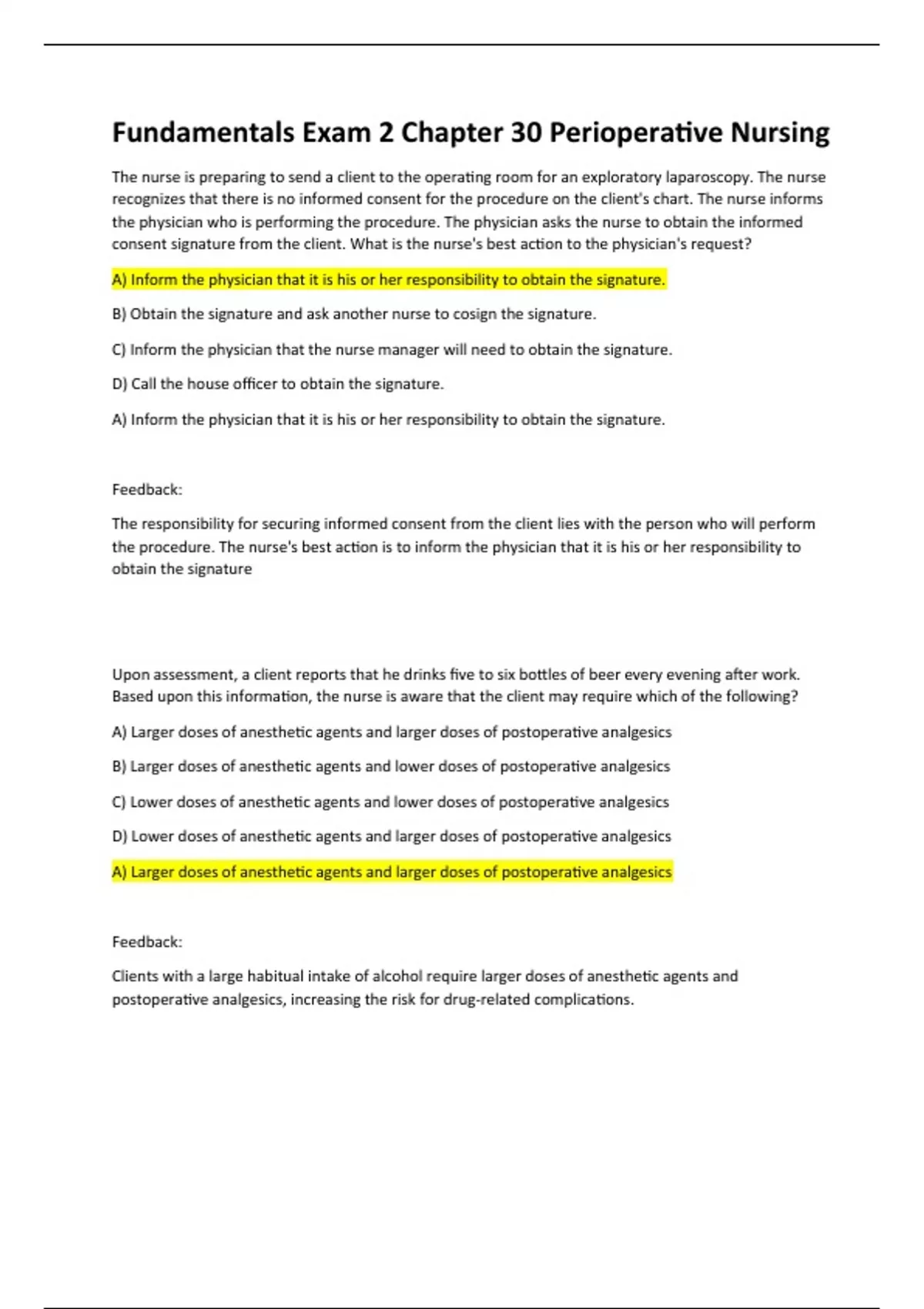 The nurse is preparing to send a client to the operating room for an exploratory laparoscopy. The nurse recognizes that there is no informed consent for the procedure on the client's chart. The nurse informs the physician who is performing the procedure. The physician asks the nurse to obtain the informed consent signature from the client. What is the nurse's best action to the physician's request? A) Inform the physician that it is his or her responsibility to obtain the signature. B) Obtain the signature and ask another nurse to cosign the signature. C) Inform the physician that the nurse manager will need to obtain the signature. D) Call the house officer to obtain the signature. A) Inform the physician that it is his or her responsibility to obtain the signature. Feedback: The responsibility for securing informed consent from the client lies with the person who will perform the procedure. The nurse's best action is to inform the physician that it is his or her responsibility to obtain the signature Upon assessment, a client reports that he drinks five to six bottles of beer every evening after work. Based upon this information, the nurse is aware that the client may require which of the following? A) Larger doses of anesthetic agents and larger doses of postoperative analgesics B) Larger doses of anesthetic agents and lower doses of postoperative analgesics C) Lower doses of anesthetic agents and lower doses of postoperative analgesics D) Lower doses of anesthetic agents and larger doses of postoperative analgesics A) Larger doses of anesthetic agents and larger doses of postoperative analgesics