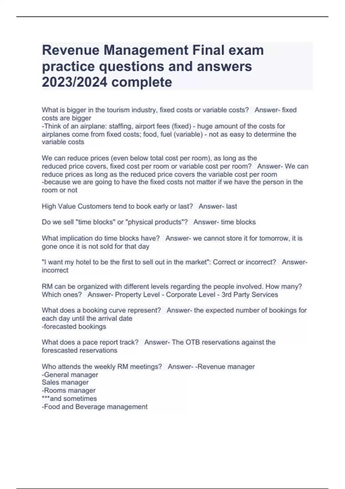 Revenue Management Final exam practice questions and answers 2023/2024 complete