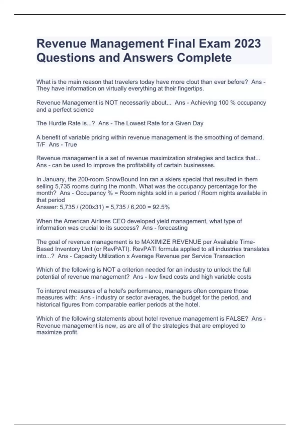 Revenue Management Final Exam 2023 Questions and Answers Complete