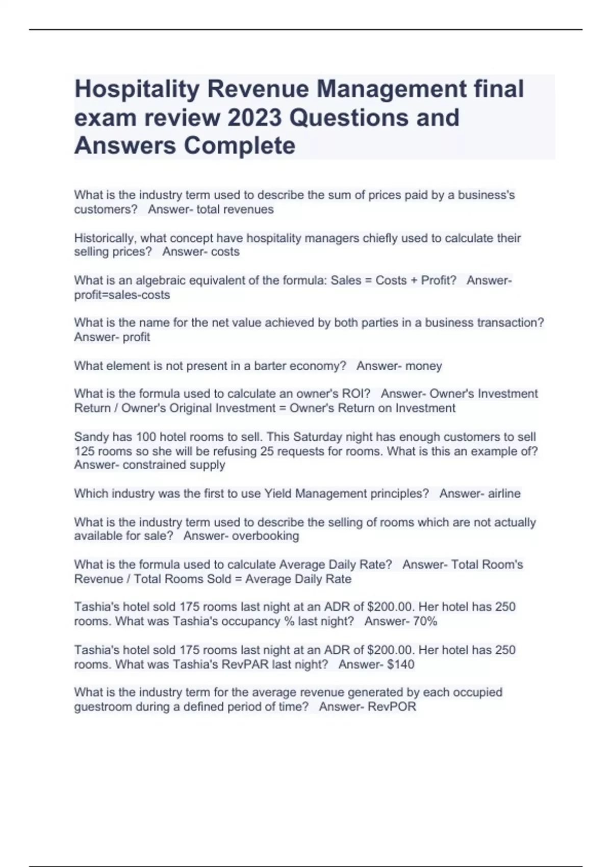 Hospitality Revenue Management final exam review 2023 Questions and Answers Complete