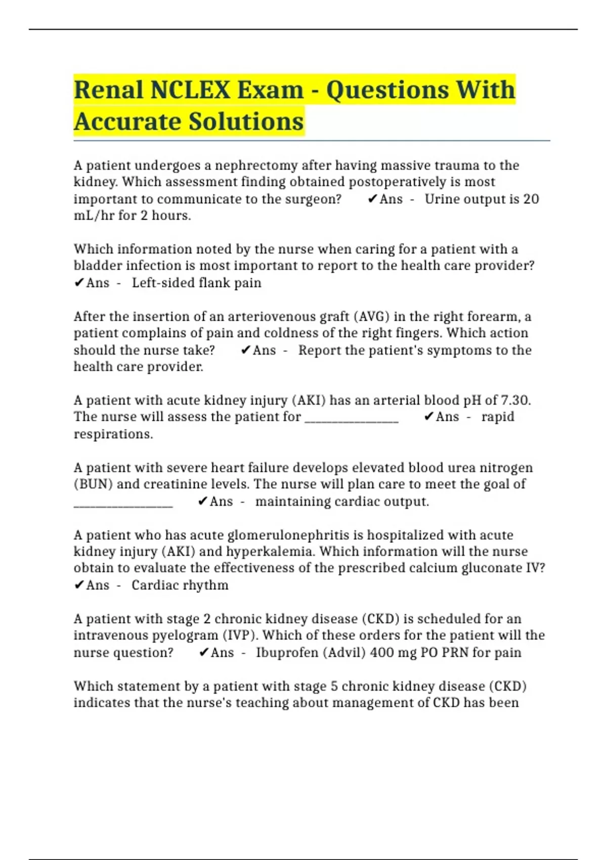 Renal NCLEX Exam - Questions With Accurate Solutions