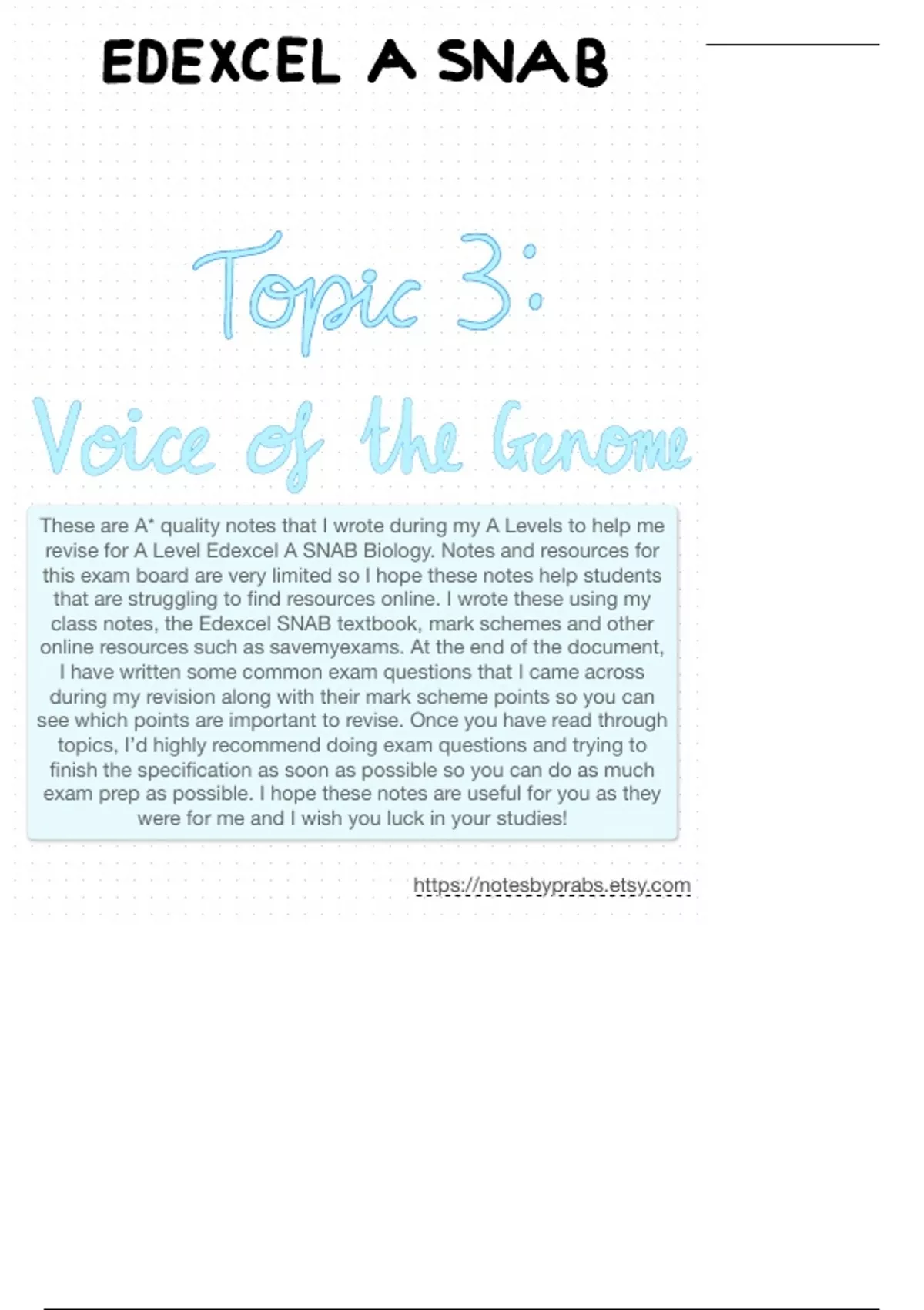 These are A* quality notes that I wrote during my A Levels to help me revise for A Level Edexcel A SNAB Biology. Notes and resources for this exam board are very limited so I hope these notes help students that are struggling to find resources online. I wrote these using my class notes, the Edexcel SNAB textbook, mark schemes and other online resources such as savemyexams. At the end of the document, I have written some common exam questions that I came across during my revision along with their mark scheme points so you can see which points are important to revise. Once you have read through topics, I’d highly recommend doing exam questions and trying to finish the specification as soon as possible so you can do as much exam prep as possible. I hope these notes are useful for you as they were for me and I wish you luck in your studies!