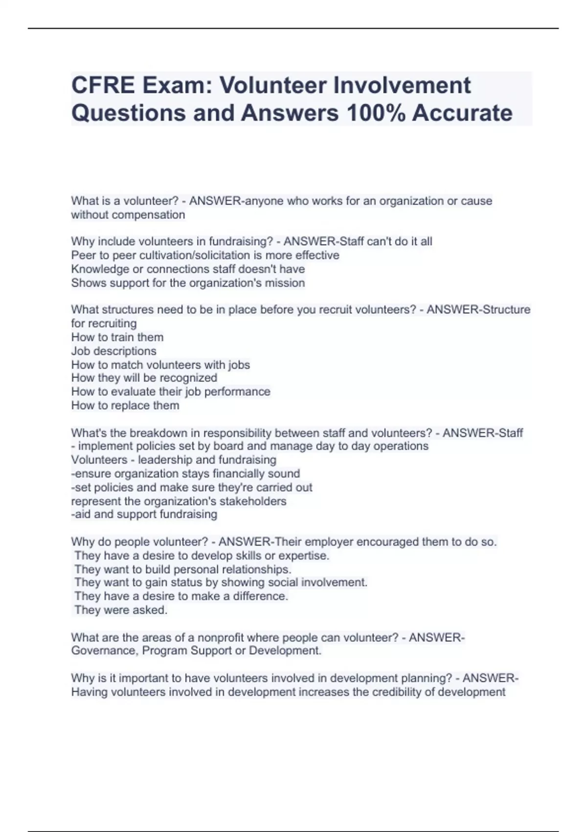 CFRE Exam: Volunteer Involvement Questions and Answers 100% Accurate CFRE Exam: Volunteer Involvement Questions and Answers 100% Accurate CFRE Exam: Volunteer Involvement Questions and Answers 100% Accurate CFRE Exam: Volunteer Involvement Questions and Answers 100% Accurate What is a volunteer? - ANSWER-anyone who works for an organization or cause without compensation Why include volunteers in fundraising? - ANSWER-Staff can't do it all Peer to peer cultivation/solicitation is more effective Knowledge or connections staff doesn't have Shows support for the organization's mission What structures need to be in place before you recruit volunteers? - ANSWER-Structure for recruiting How to train them Job descriptions How to match volunteers with jobs How they will be recognized