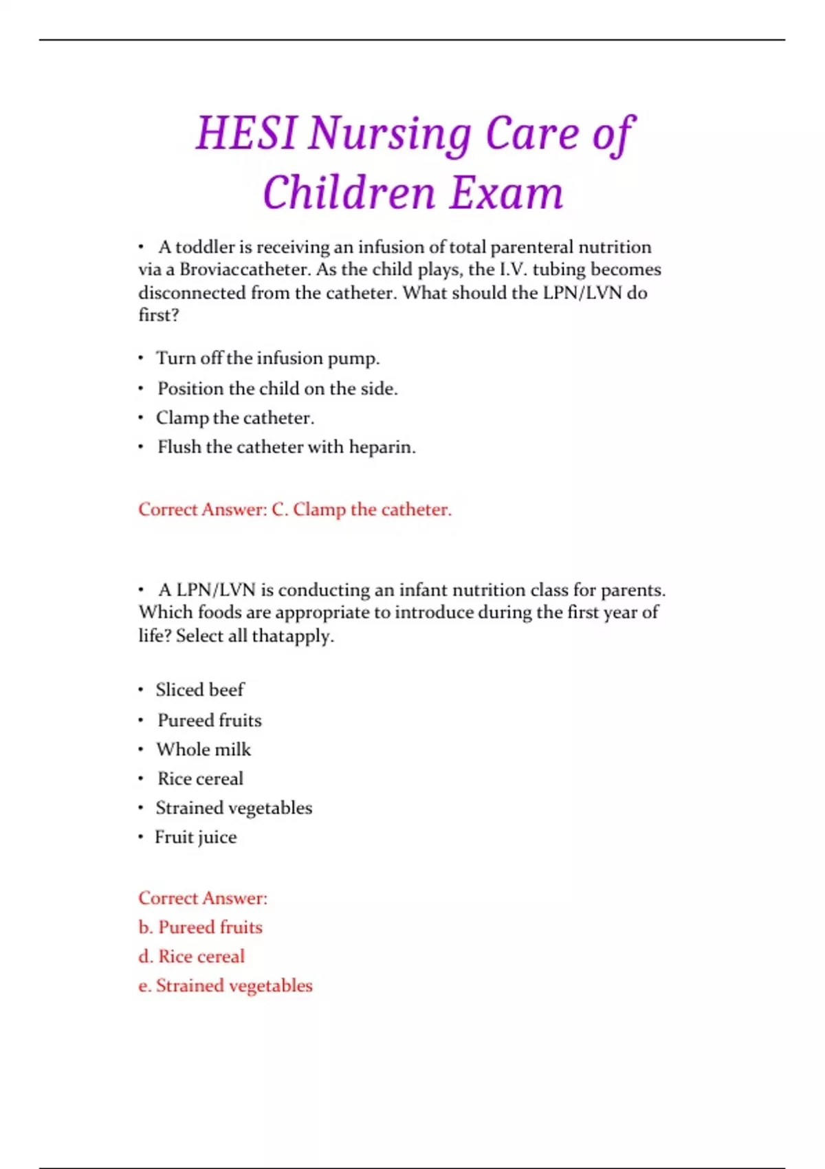 HESI Nursing Care of Children Exam . Latest 2023.A toddler is receiving an infusion of total parenteral nutrition via a Broviac catheter. As the child plays, the I.V. tubing becomes disconnected from the catheter. What should the LPN/LVN do first? • Turn off the infusion pump. • Position the child on the side. • Clamp the catheter. • Flush the catheter with heparin. Correct Answer: C. Clamp the catheter. • A LPN/LVN is conducting an infant nutrition class for parents. Which foods are appropriate to introduce during the first year of life? Select all that apply. • Sliced beef • Pureed fruits • Whole milk • Rice cereal • Strained vegetables • Fruit juice Correct Answer: b. Pureed fruits d. Rice cereal e. Strained vegetables • A mother tells the nurse that her preschool-age daughter with spina bifida sneezes and gets a rash when playing with brightly colored balloons, and that recently she had an allergic reaction after eating kiwifruit and bananas. Th