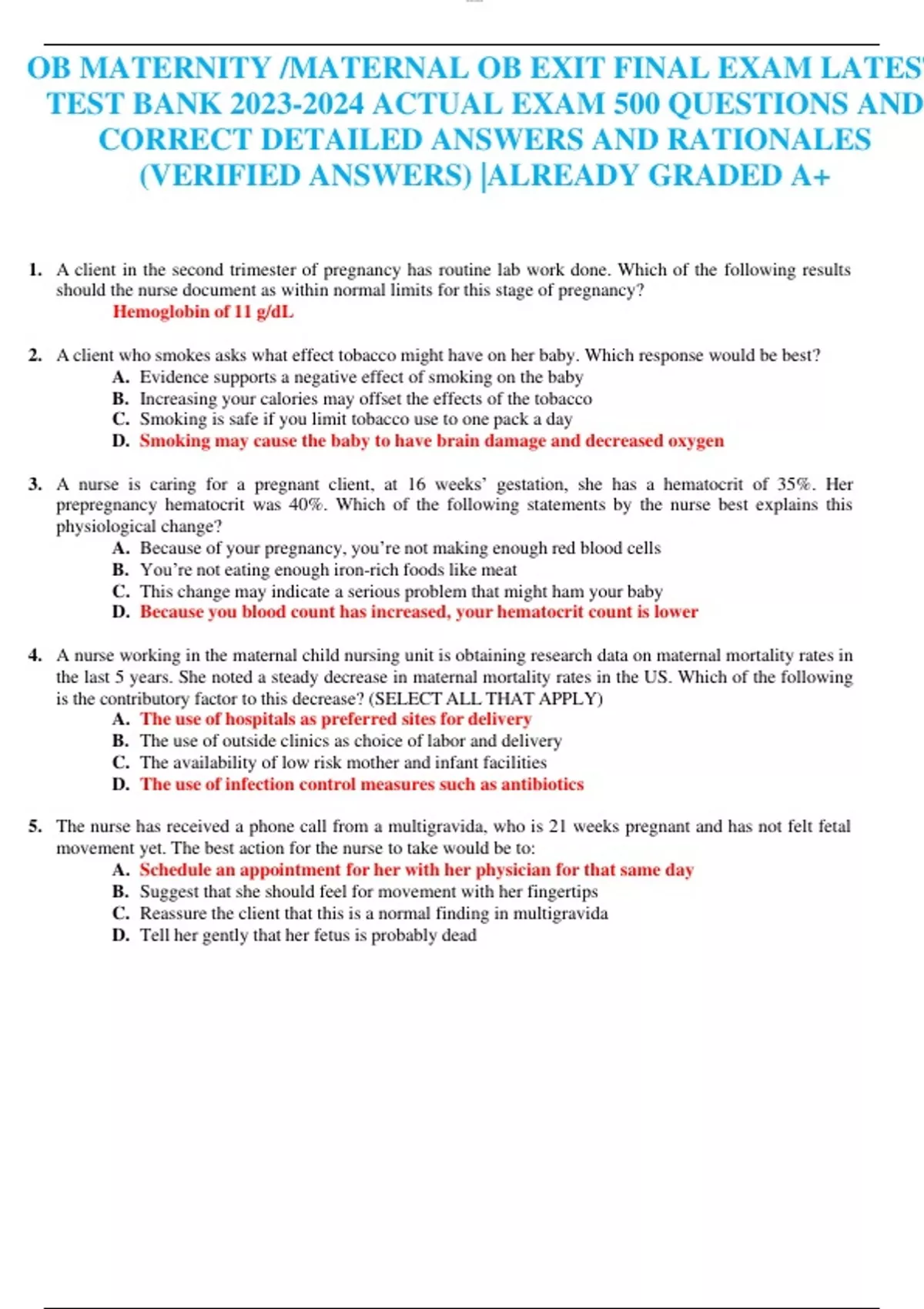 OB MATERNITY /MATERNAL OB EXIT FINAL EXAM LATEST TEST BANK ACTUAL EXAM 500 QUESTIONS AND CORRECT DETAILED ANSWERS AND RATIONALES (VERIFIED ANSWERS) |ALREADY GRADED A+