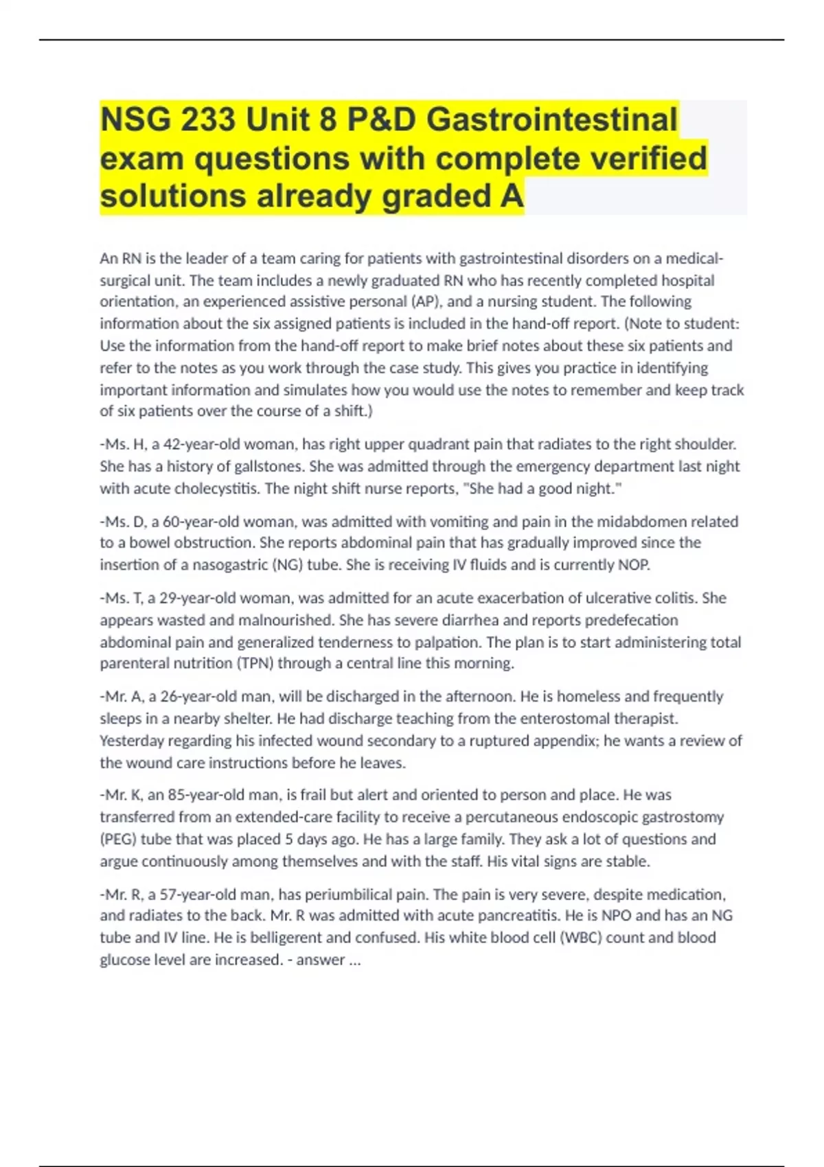 NSG 233 Unit 8 P&D Gastrointestinal exam questions with complete verified solutions already graded A