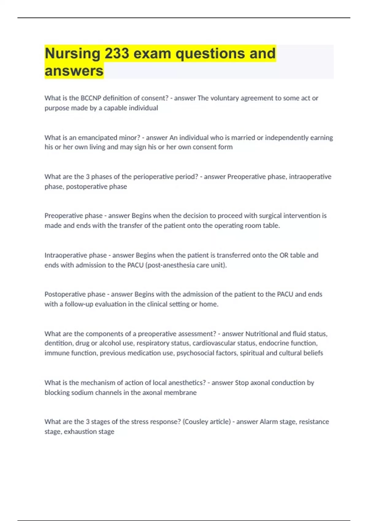 nursing 233 exam questions and answers