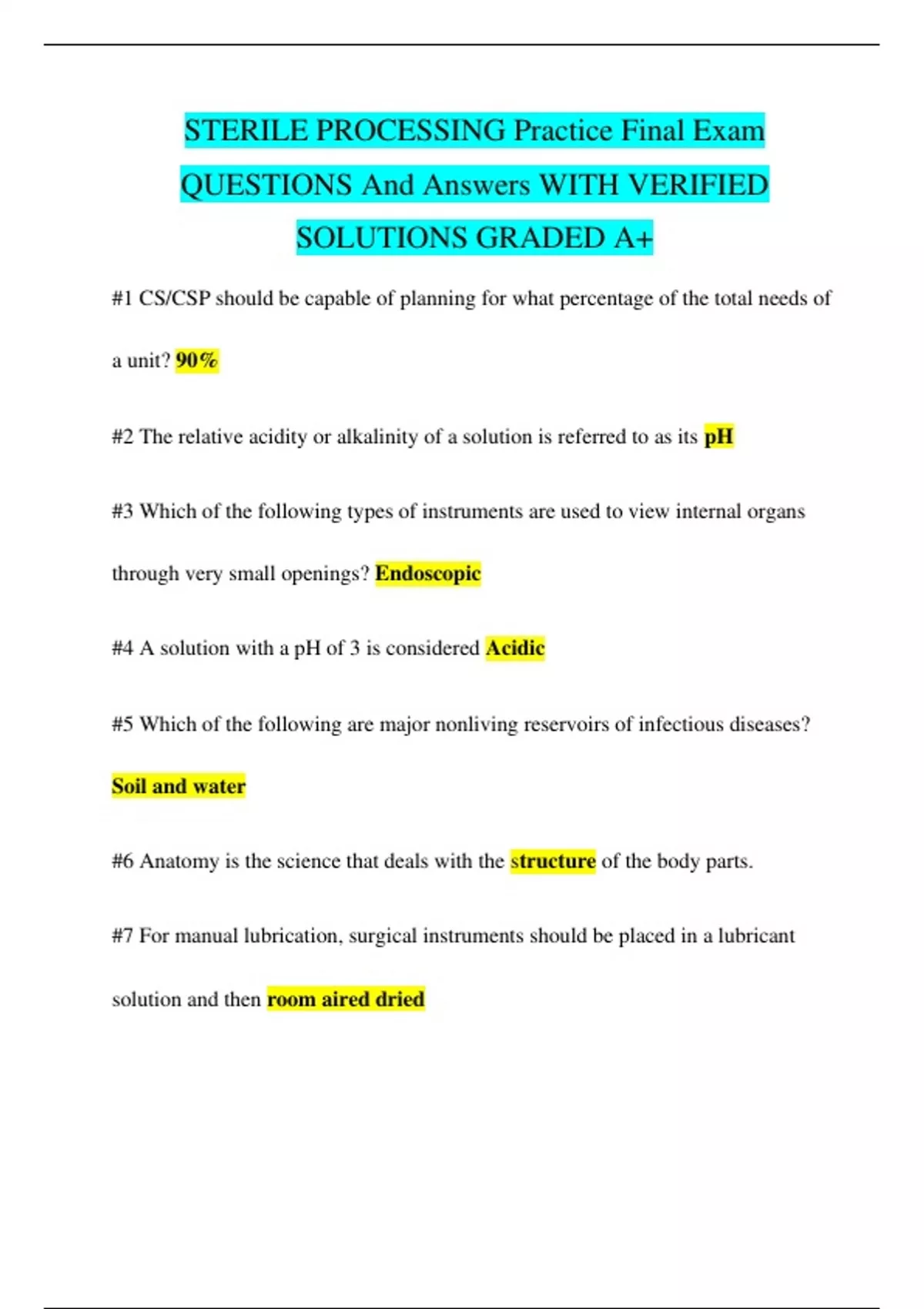STERILE PROCESSING Practice Final Exam QUESTIONS And Answers WITH VERIFIED SOLUTIONS GRADED A+ #1 CS/CSP should be capable of planning for what percentage of the total needs of a unit? 90% #2 The relative acidity or alkalinity of a solution is referred to as its pH #3 Which of the following types of instruments are used to view internal organs through very small openings? Endoscopic #4 A solution with a pH of 3 is considered Acidic #5 Which of the following are major nonliving reservoirs of infectious diseases? Soil and water #6 Anatomy is the science that deals with the structure of the body parts. #7 For manual lubrication, surgical instruments should be placed in a lubricant solution and then room aired dried
